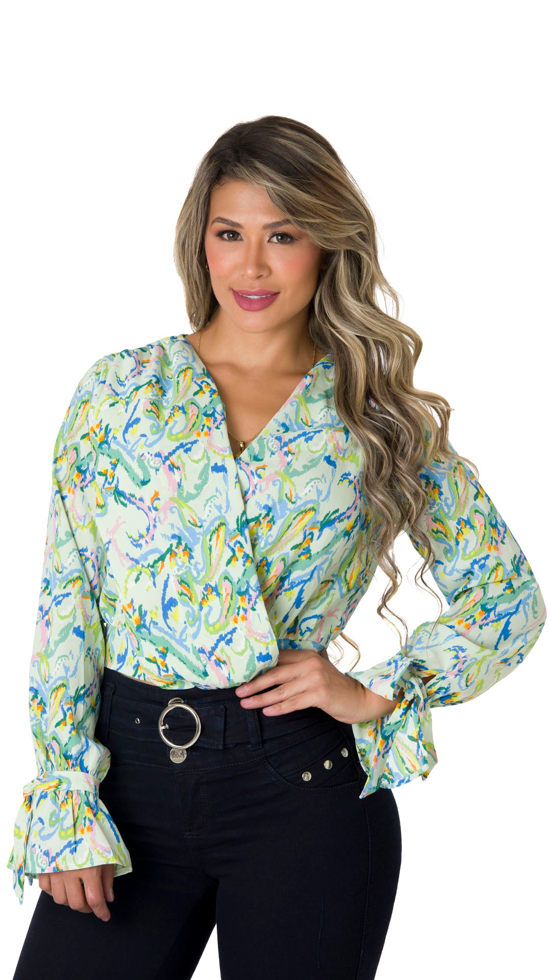 Esta blusa con mangas acampanadas que añadiran un toque único a tu outfit, ¡seguro atraerás las miradas! El escote en V y el estampado en toda la prenda agrega un encanto que resiste el paso del tiempo.