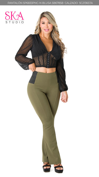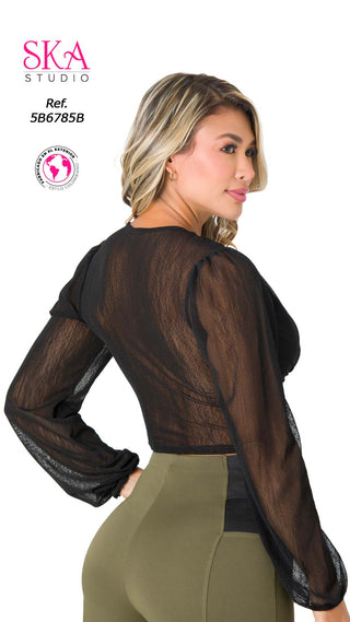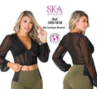 Esta blusa tipo corset combina transparencias y encaje en una sola pieza. Su ajuste frontal de broches y escote en V, estiliza tu silueta y crea un look moderno y atrevido. Las mangas largas en malla aportan un aire romántico y elegante. Ideal para noches especiales o para elevar un outfit casual con un toque de glamour.