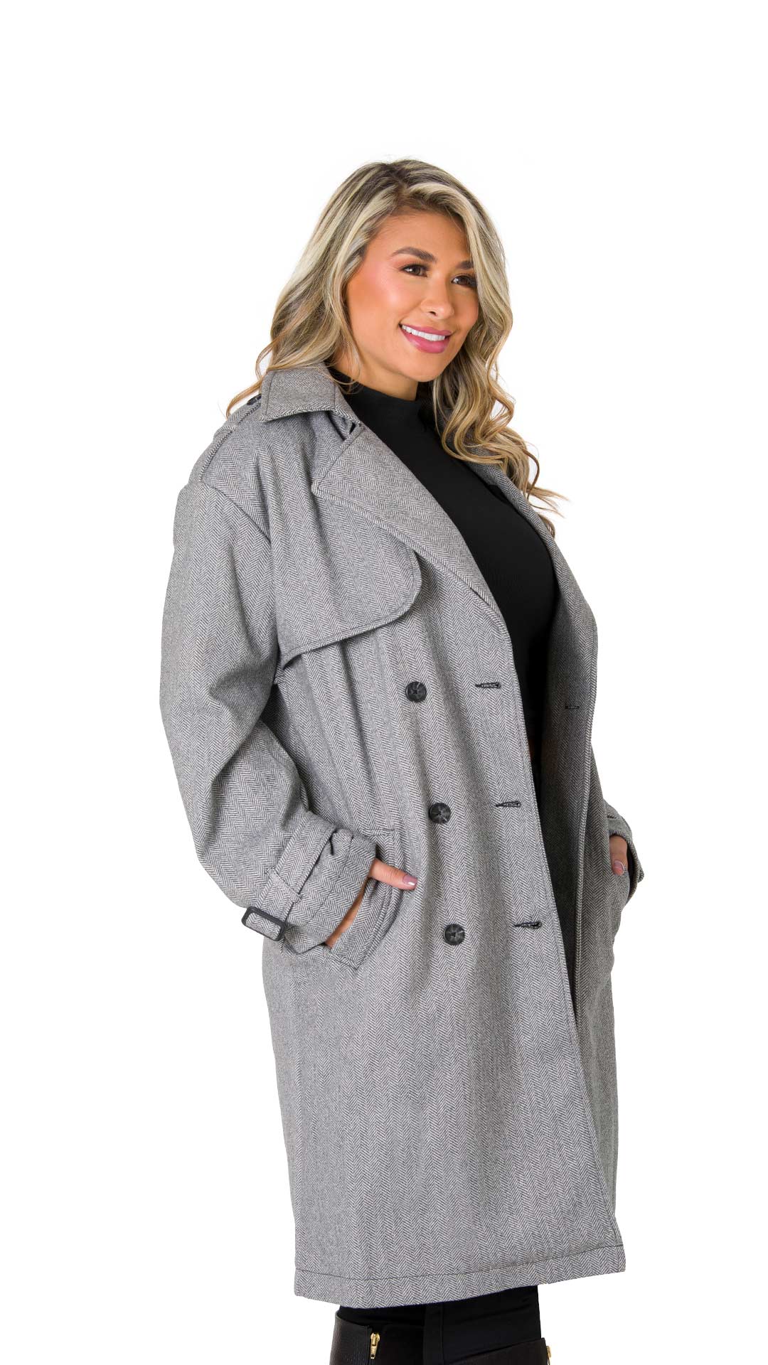 Dale un toque chic a tus outfits de invierno con este abrigo gris de corte clásico. Perfecto para cualquier ocasión, cuenta con una doble botonadura que realza tu figura y un diseño largo que te protege del frío. Combínalo con botas altas para un look sofisticado o con tenis para un estilo relajado.
