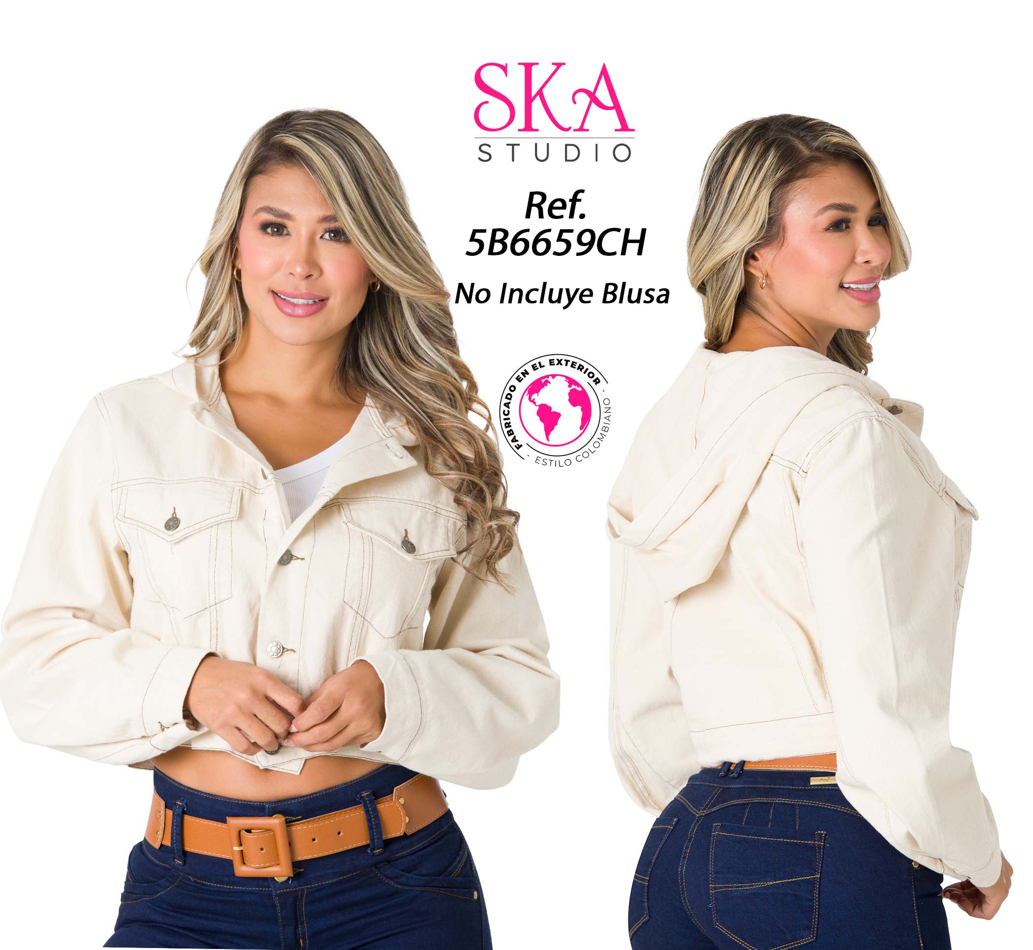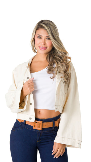 Esta chaqueta con capucha tipo denim es una prenda esencial. Su diseño corto estiliza la silueta y su color neutro la convierte en una opción versátil para cualquier ocasión. Úsala abierta sobre blusas cortas o camisetas para lograr un look moderno y cómodo.