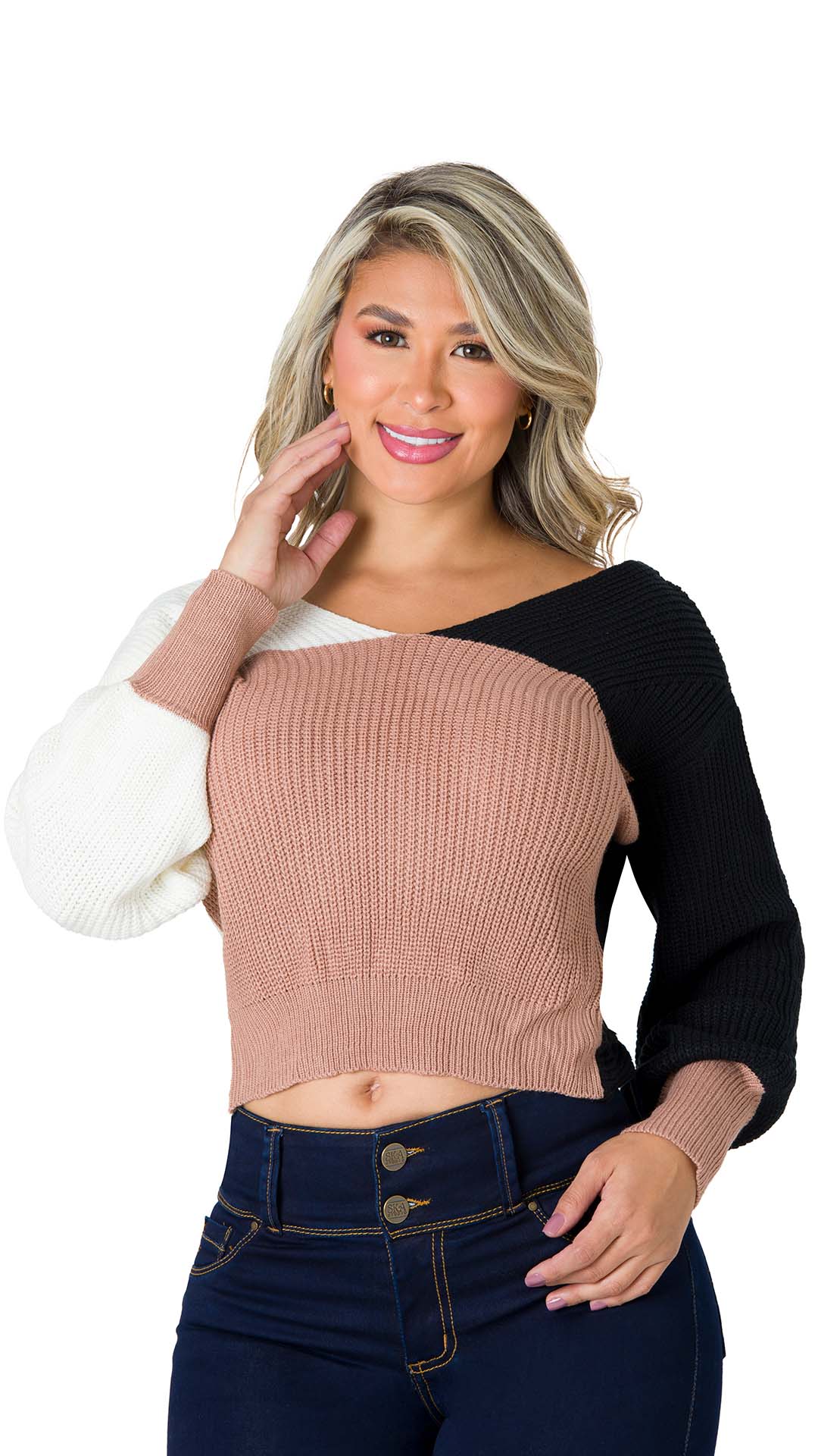 Dale un toque moderno y divertido a tus outfits con este suéter. Su diseño asimétrico combina tonos beige, negro y blanco, creando un look único y versátil. Con mangas largas y un ajuste cómodo, es perfecto para los días frescos y para destacar con estilo.