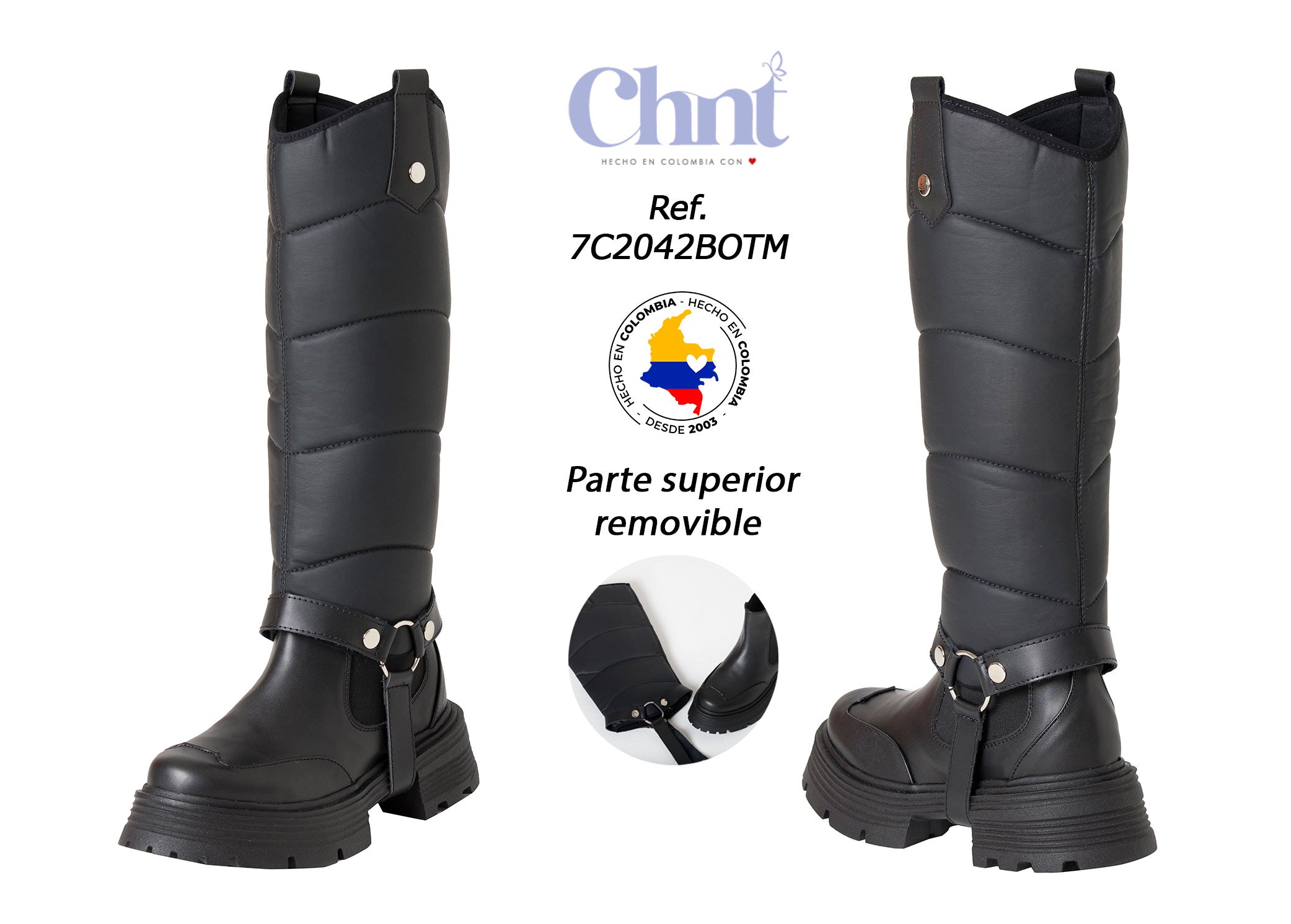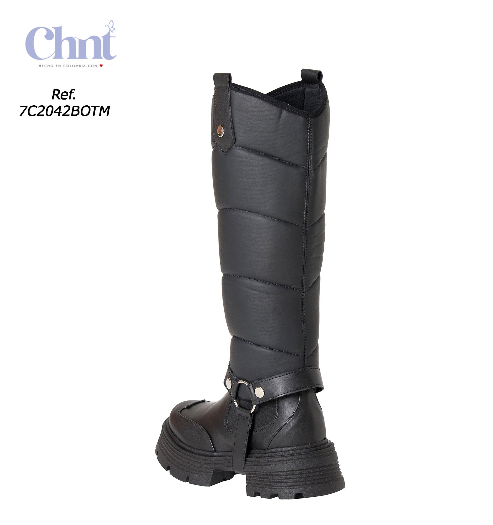 Estas botas negras de caña alta y corta con detalles acolchados y plataforma son perfectas para lucir moderna y cómoda en días frescos. Su diseño robusto y contemporáneo las convierte en el complemento ideal para cualquier look casual o urbano.