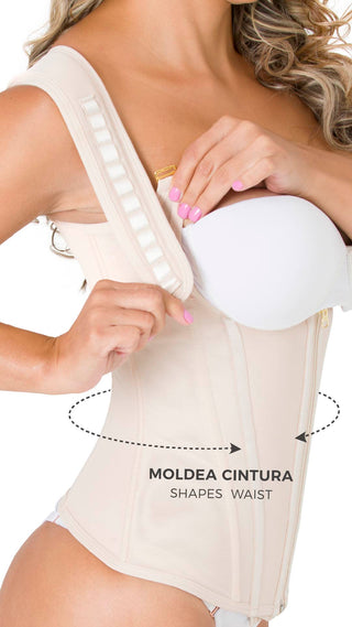 ¡Transforma tu figura y luce espectacular! Este chaleco moldeador está diseñado para estilizar tu silueta, ofrecer soporte y brindarte la confianza que mereces. Ideal para uso diario y rutinas de ejercicio, cuenta con broches y cierre frontal para un ajuste más comodo y tiras graduables. Moldea cintura, abdomen y espalda.