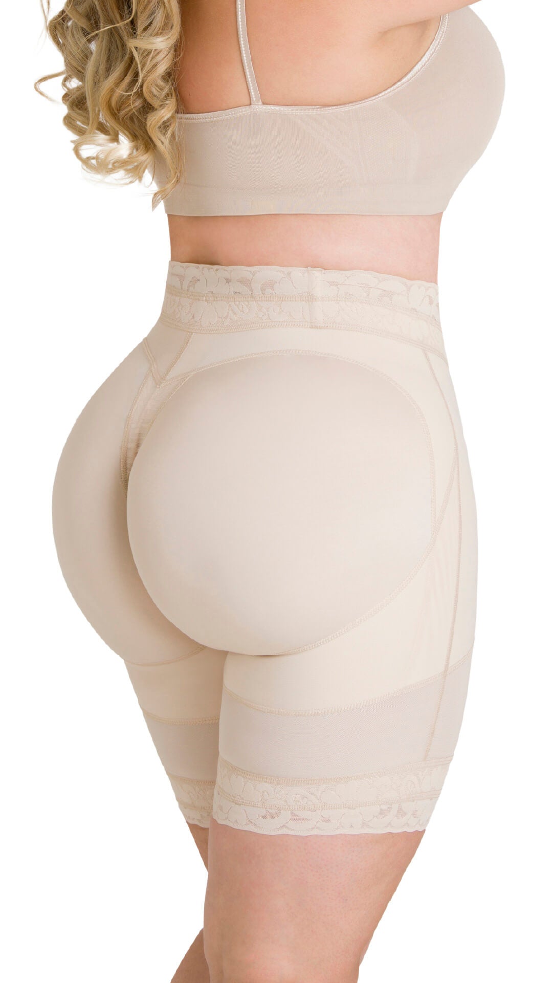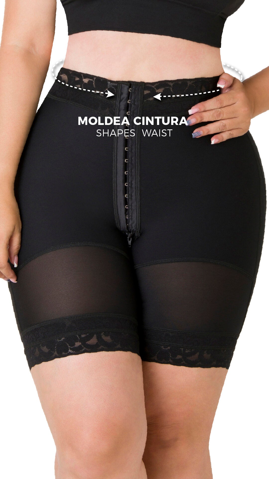 Faja estilo short tipo reloj de arena, con 4 niveles de broches para ajuste personalizado y es compresión media. Esta faja está especialmente diseñada para mujeres con cintura pequeña, caderas grandes y anchas. Es levantacola y te ayuda a moldear tus caderas de manera natural. Cuenta con un sistema de encaje y bandas siliconadas que se adhieren a la piel, garantizando comodidad y evitando el enrollamiento constante.