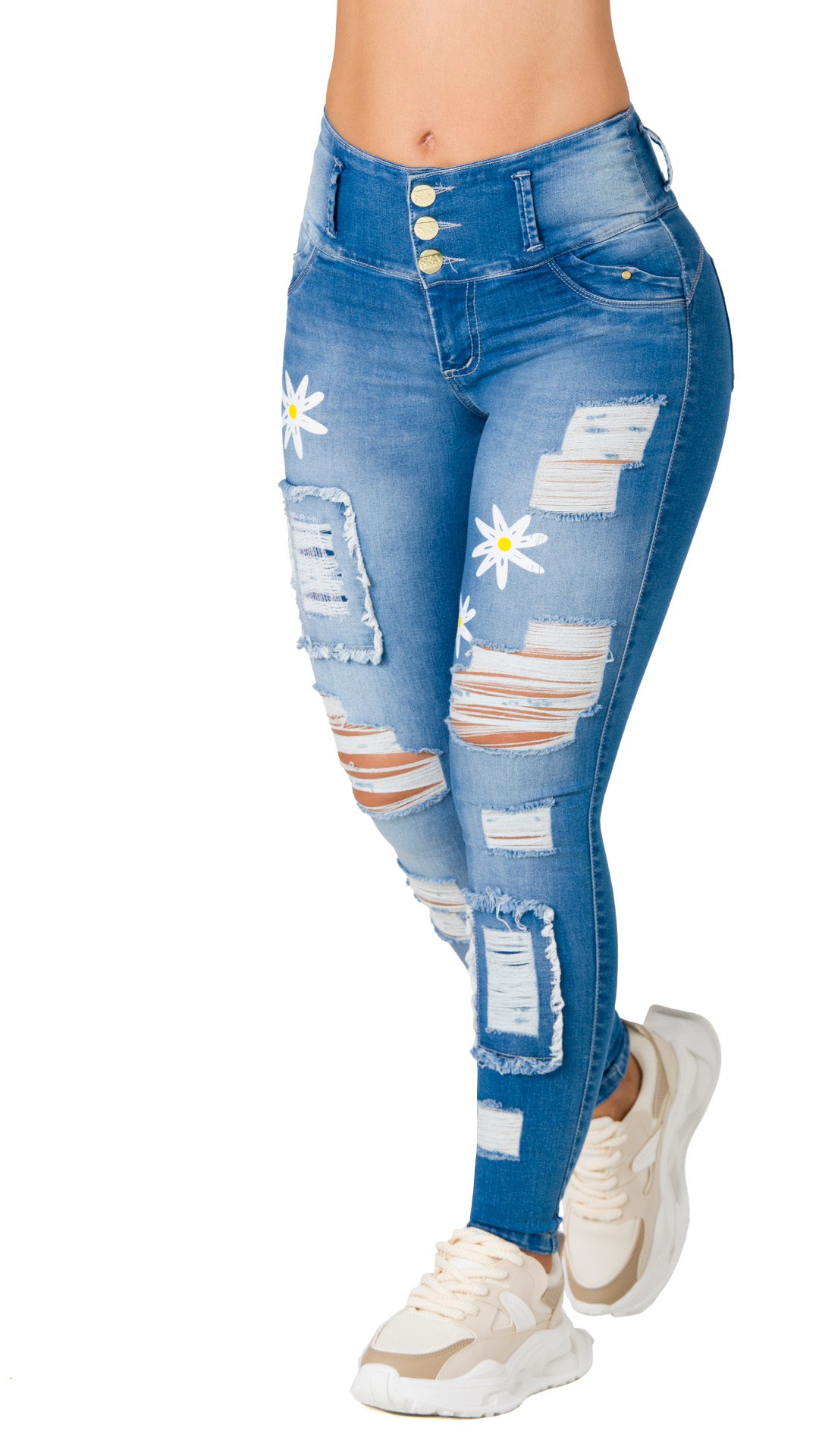 Estos jeans de tiro alto ofrecen un look fresco y juvenil, con un diseño de destroyed y estampado de margaritas combina un estilo atrevido y femenino, son perfectos para crear outfits únicos que te harán destacar en cualquier ocasión.