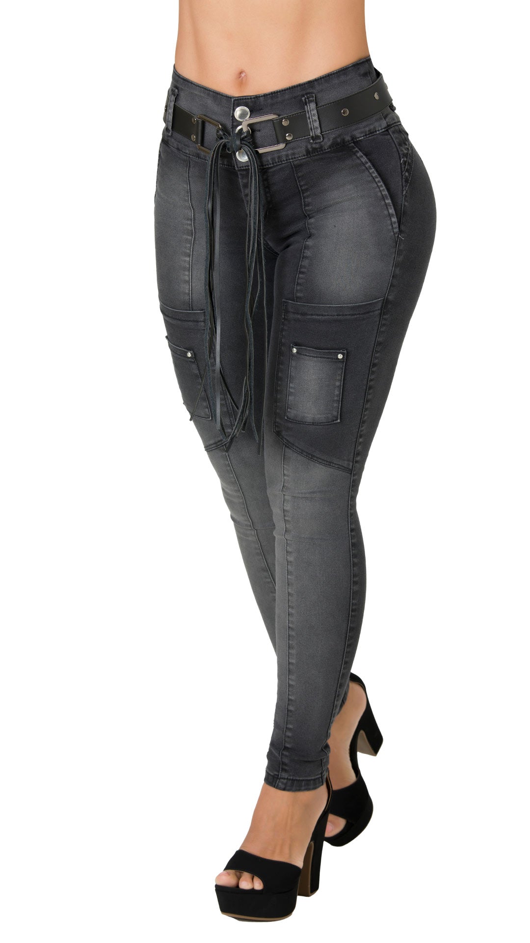 Jean cargo tiro alto: moderno, estilizado y perfecto para resaltar tu figura combina el estilo urbano de los bolsillos cargo con un diseño ajustado que moldea caderas y piernas de forma favorecedora. Su tiro alto define la cintura, mientras el cinturón con detalles metálicos y tiras largas agrega un toque trendy que eleva todo el look.