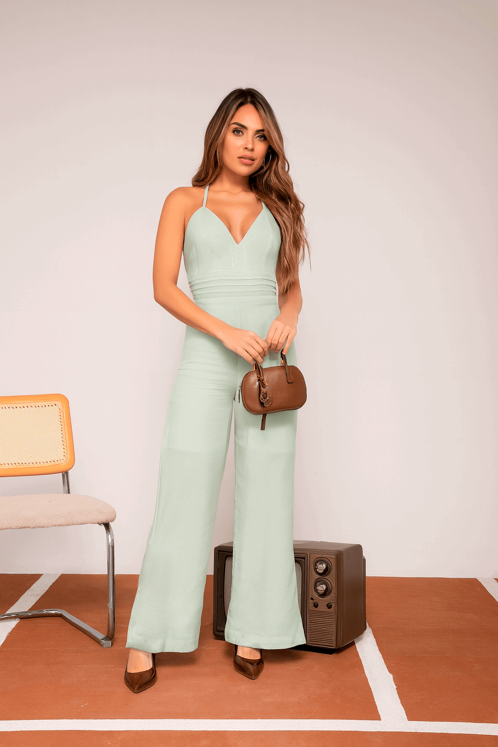 Este enterizo verde claro es ideal para crear un look relajado pero con mucho estilo. Su escote en V, tiras delgadas y corte wide leg estilizan tu figura y te dan ese aire chic y femenino que buscas. Perfecto para brunch, eventos de día o simplemente para sentirte increíble. ¡Súmalo a tu clóset y lúcelo con confianza!