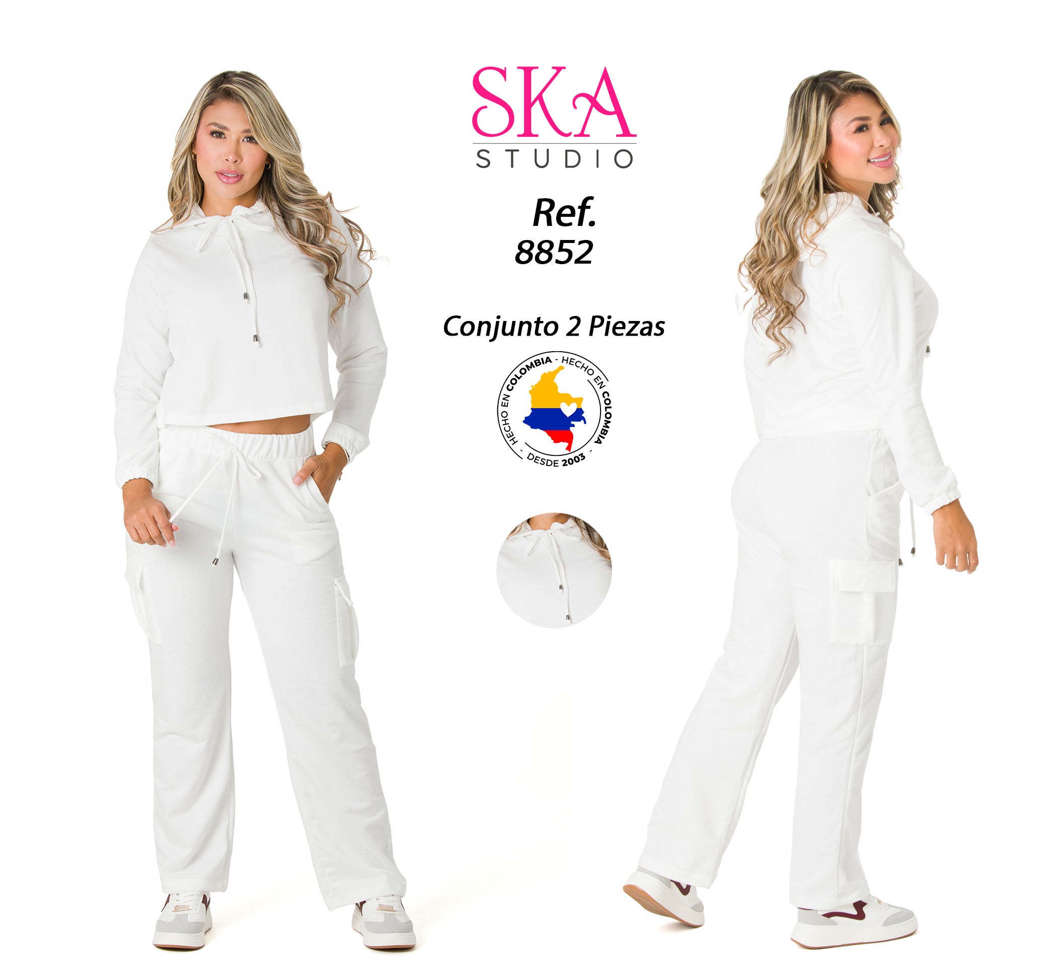 Dale un aire moderno y cómodo a tu estilo con este conjunto deportivo blanco, compuesto por un buzo crop con capucha ajustable y un pantalón cargo de tiro alto con bolsillos laterales. Su diseño versátil une lo casual con lo trendy, perfecto para moverte con libertad sin perder el estilo.