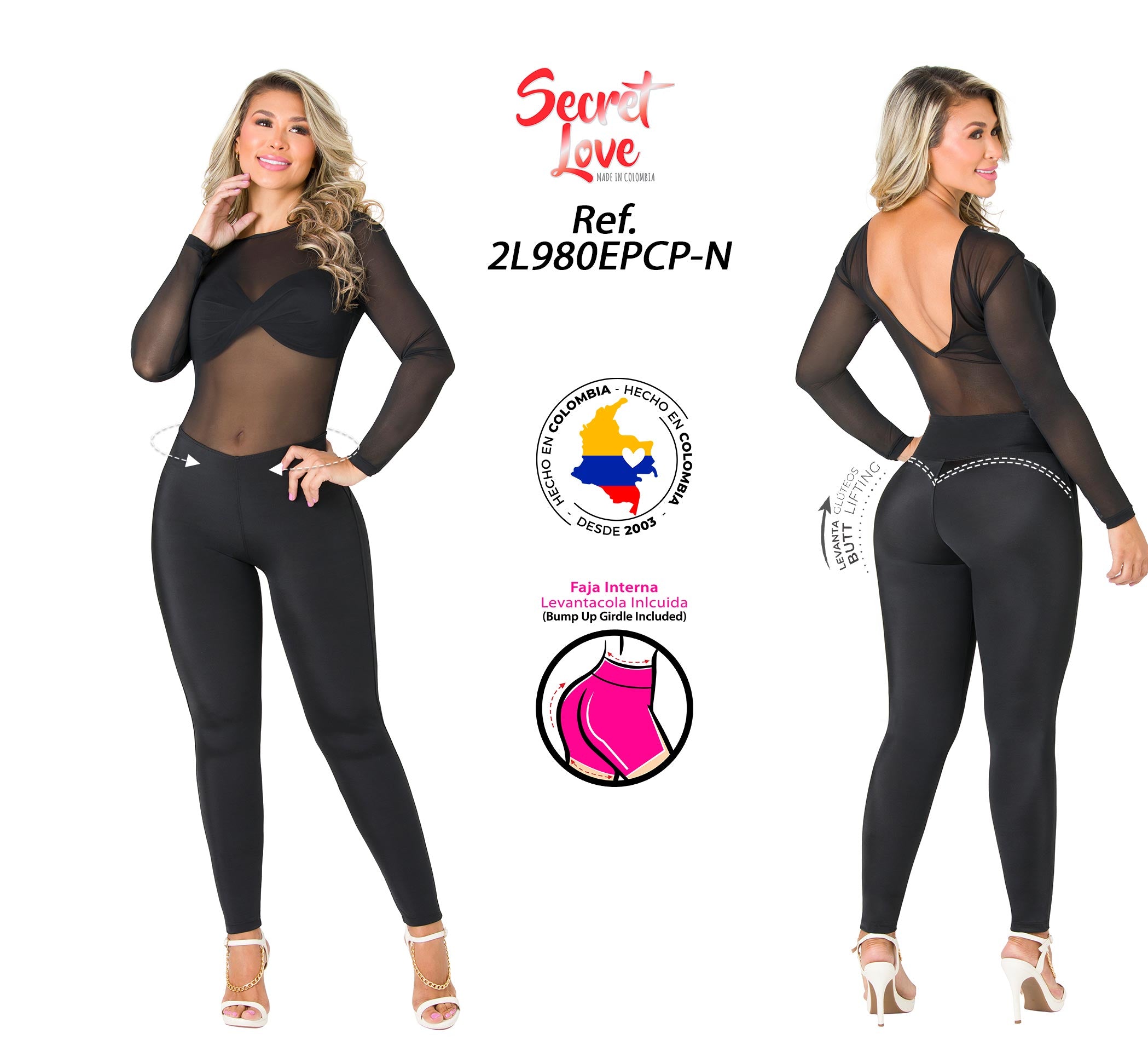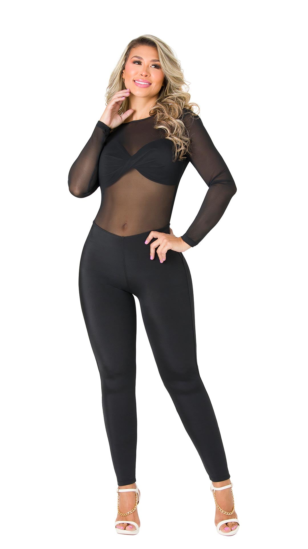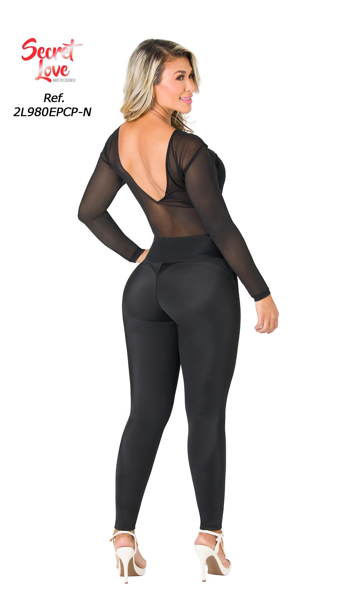 Leggings de cintura alta con faja interna que realza glúteos y aplana el abdomen. Su diseño enterizo con powernet moldea piernas y reduce cintura. En color negro, con bota pitillo y pretina control, este legging de manga larga y cuello corazón es perfecto para un look elegante y controlado.