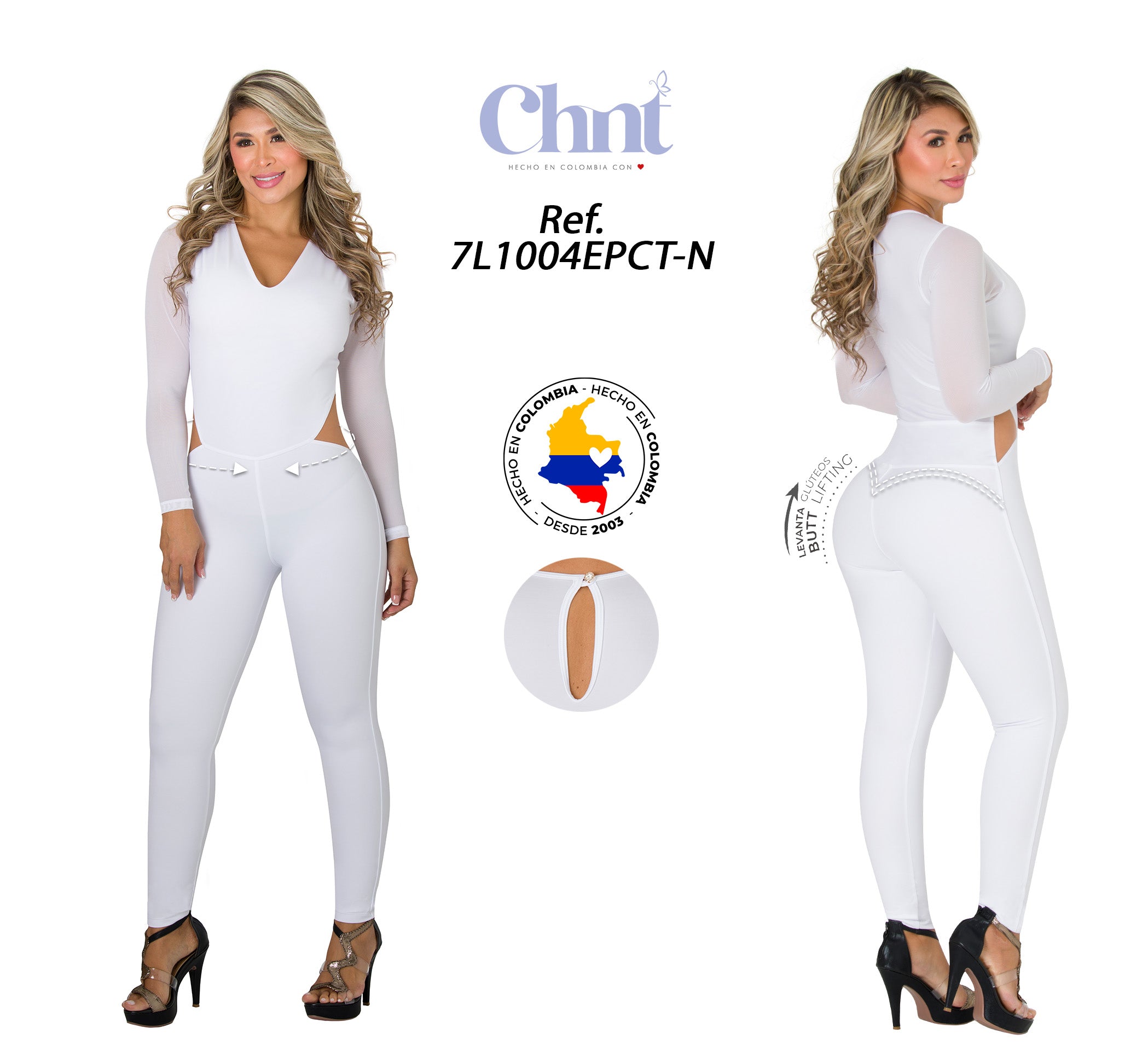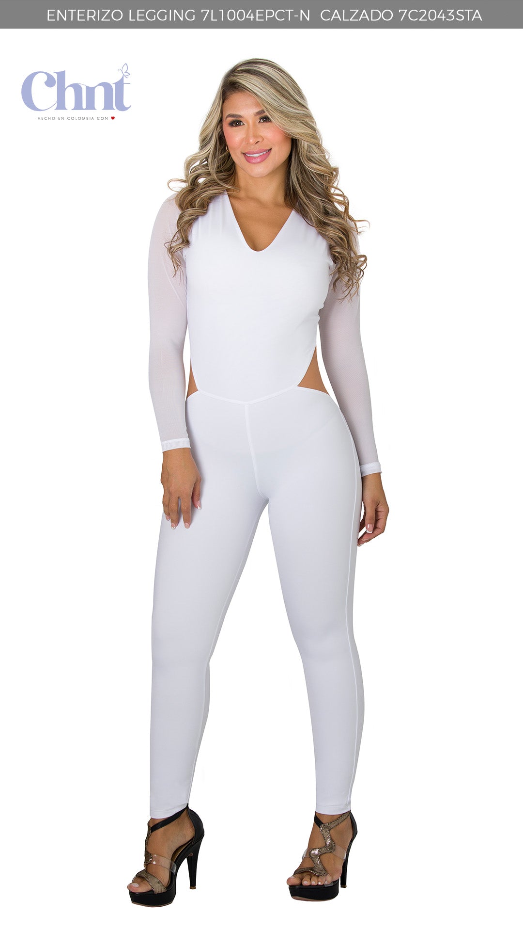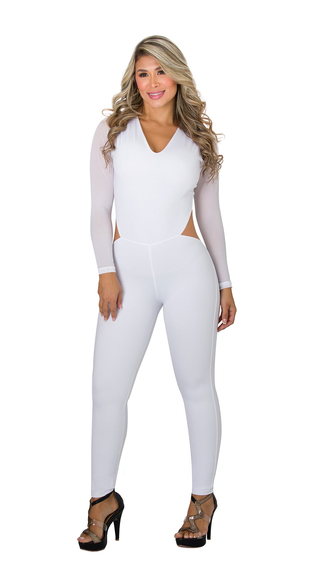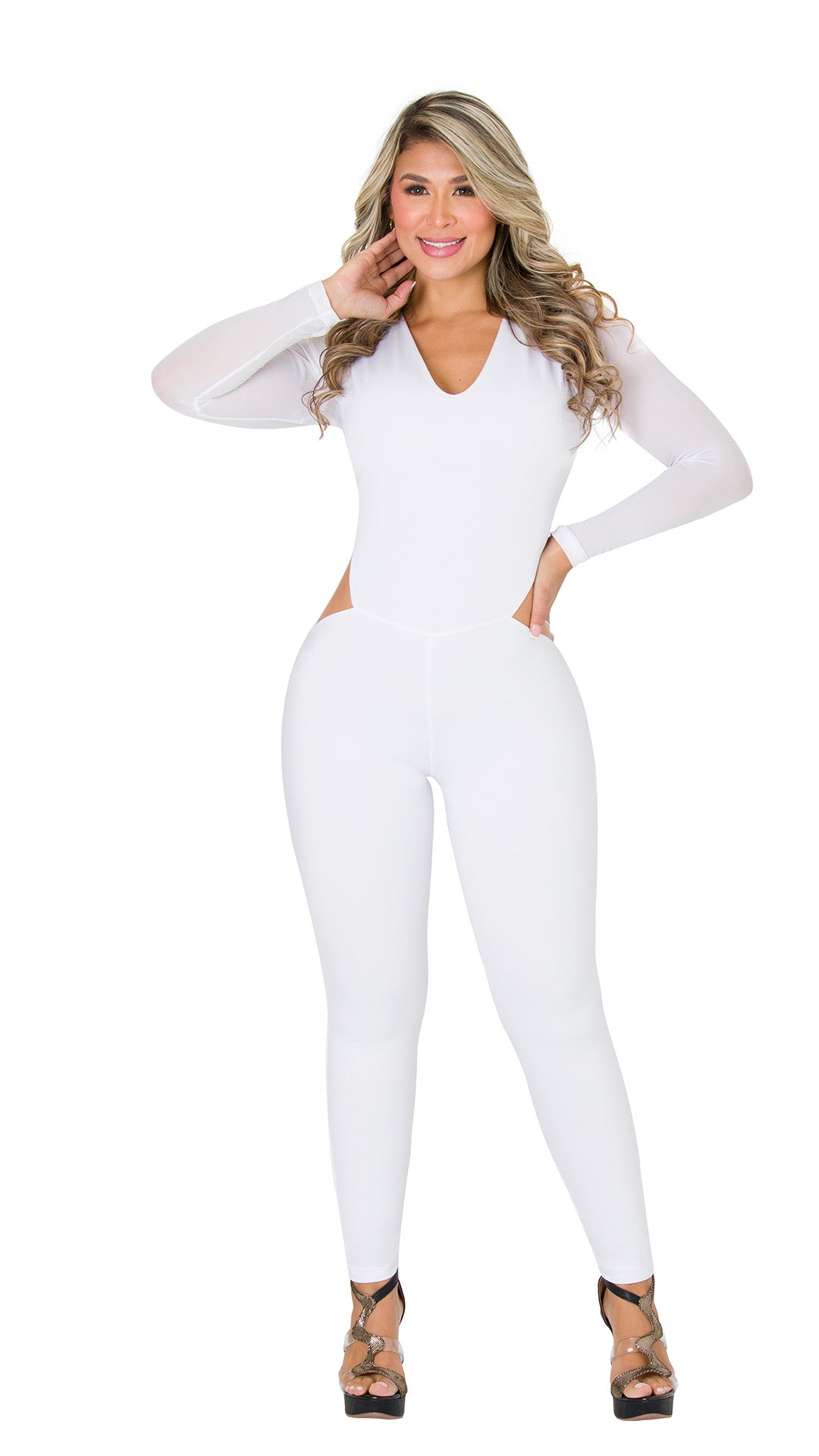 Este espectacular enterizo blanco es perfecto para quienes buscan una prenda versátil y sofisticada. Su diseño de manga larga, escote en “V”, cintura alta y efecto levantacola estiliza la silueta, definiendo curvas con un ajuste cómodo y favorecedor. Es ideal para salidas nocturnas o eventos especiales.