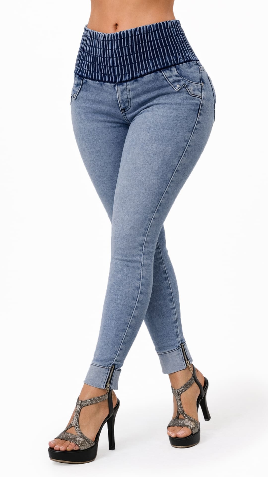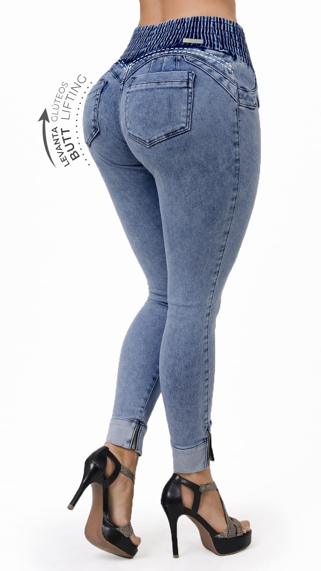 Este jean en denim azul claro redefine la silueta gracias a su innovador diseño con pretina ancha elástica tipo corset. La cintura estructurada ayuda a estilizar visualmente el abdomen, aportando soporte y definición sin sacrificar comodidad. Su efecto envolvente crea una figura más armónica y favorecedora desde el primer uso.