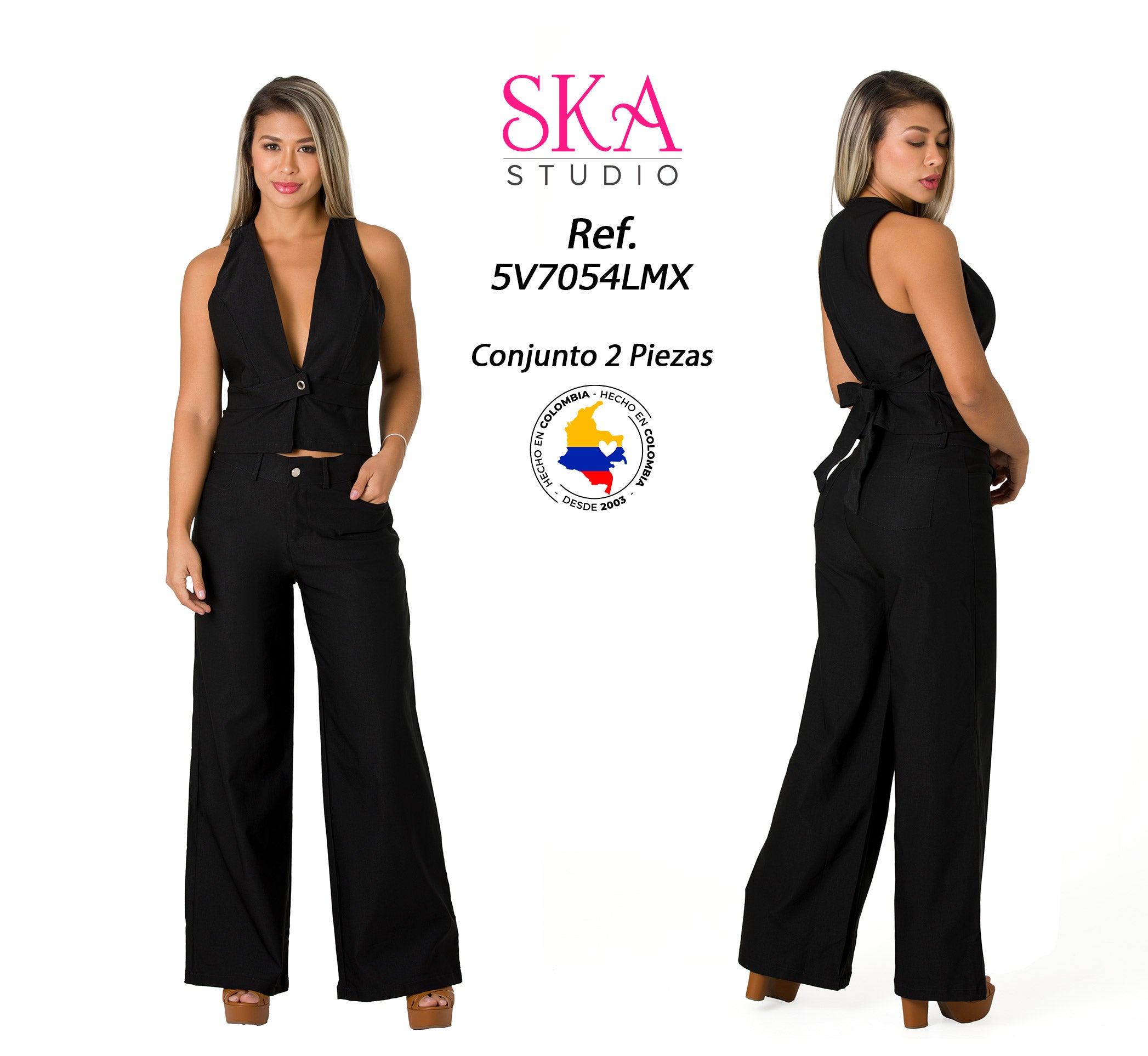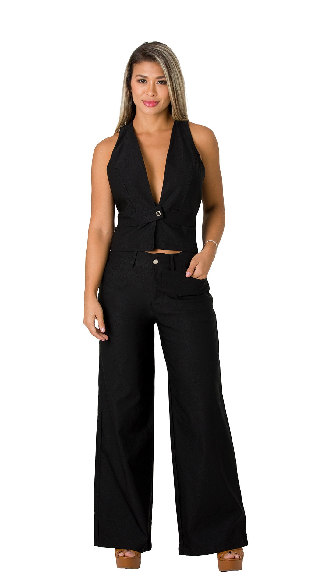 Este conjunto combina un chaleco con escote profundo que aporta un toque sofisticado y actual, con un pantalón de bota ancha que estiliza la figura y crea una silueta alargada. Su diseño estructurado realza la cintura y ofrece un look femenino, seguro y lleno de actitud.
