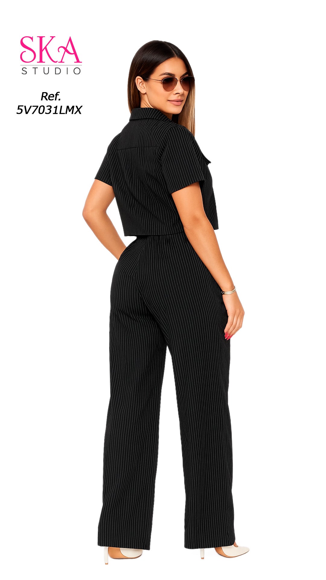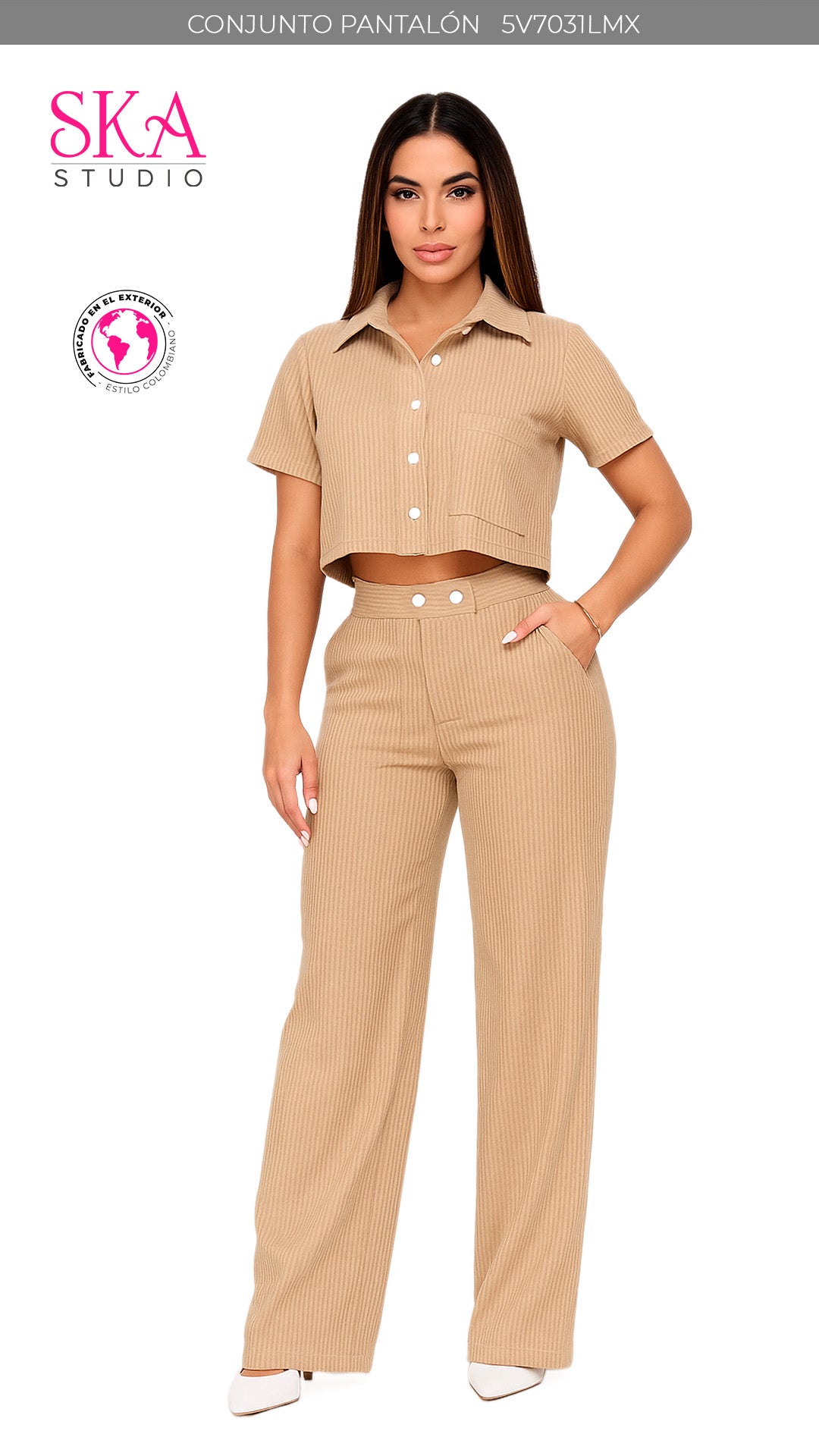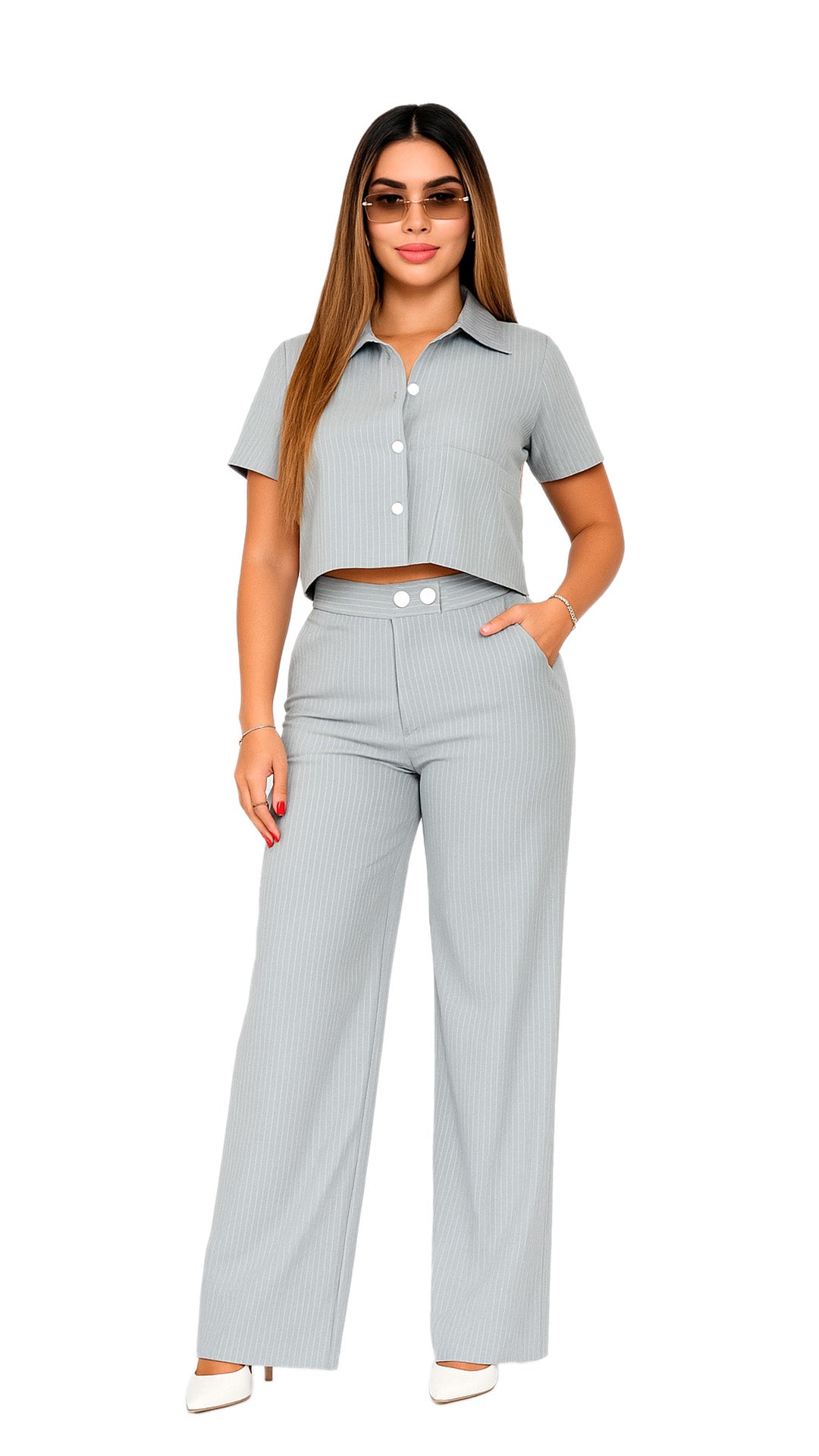 Luce impecable con este conjunto tipo sastre de dos piezas, diseñado para mujeres que combinan elegancia y actitud. Su blusa crop de botones y pantalón de tiro alto con bota ancha estilizan tu figura y aportan un aire refinado pero moderno.