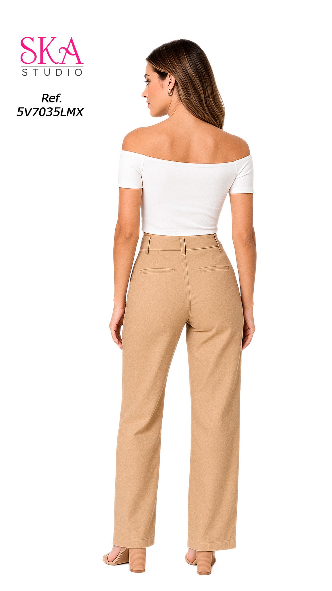 Luce moderna y segura con este conjunto de dos piezas que combina top blanco tipo off shoulder con pantalón de tiro alto y bota recta, una mezcla perfecta entre elegancia y sensualidad.