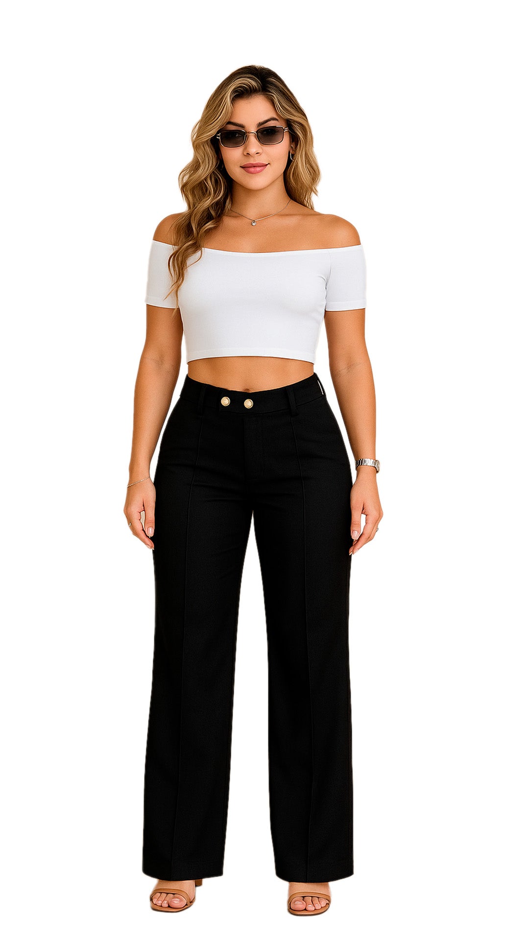 El crop ajustado resalta tu figura, mientras el pantalón de corte recto estiliza tus piernas y define tu cintura gracias a sus botones dorados decorativos.
