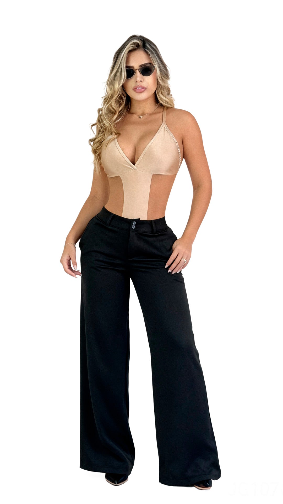 Deslumbra con este conjunto moderno de dos piezas, diseñado para mujeres seguras que aman resaltar su figura con estilo. El body con escote profundo realza tus curvas con elegancia, mientras el pantalón bota ancha aporta un toque sofisticado y alarga visualmente tu silueta.