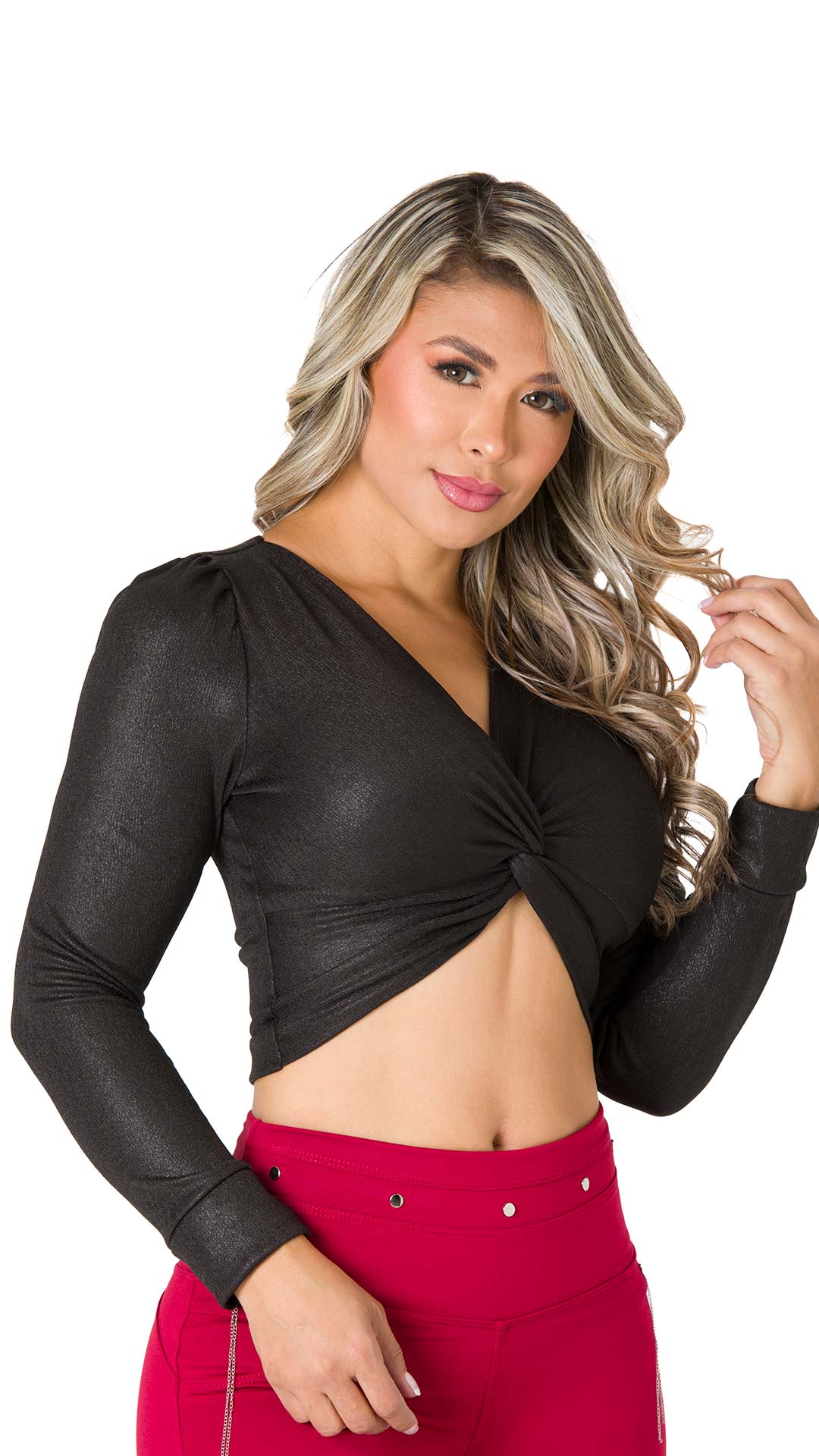 Highlight your style with this black knotted front crop top with long sleeves. Its design is perfect for urban, party, or casual looks due to its flattering cut and slightly shiny fabric. Wear it with high-waisted jeans or leggings.