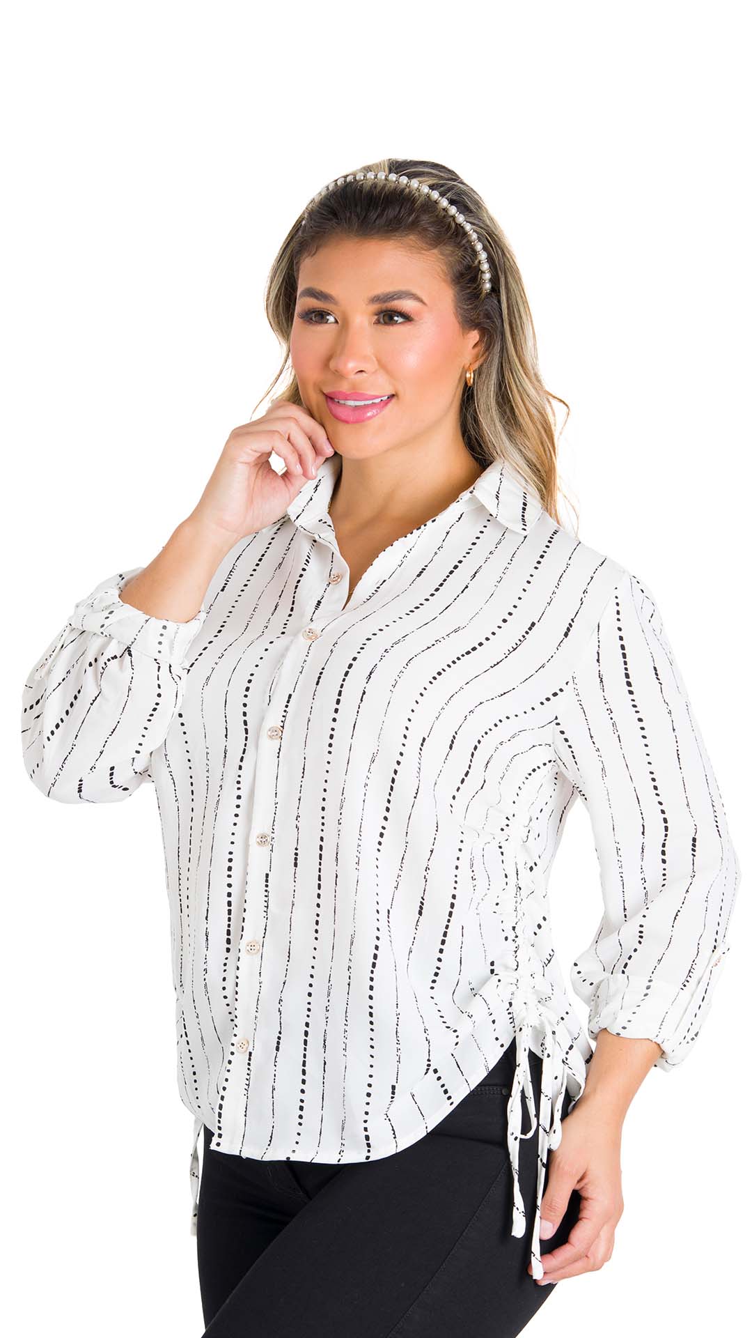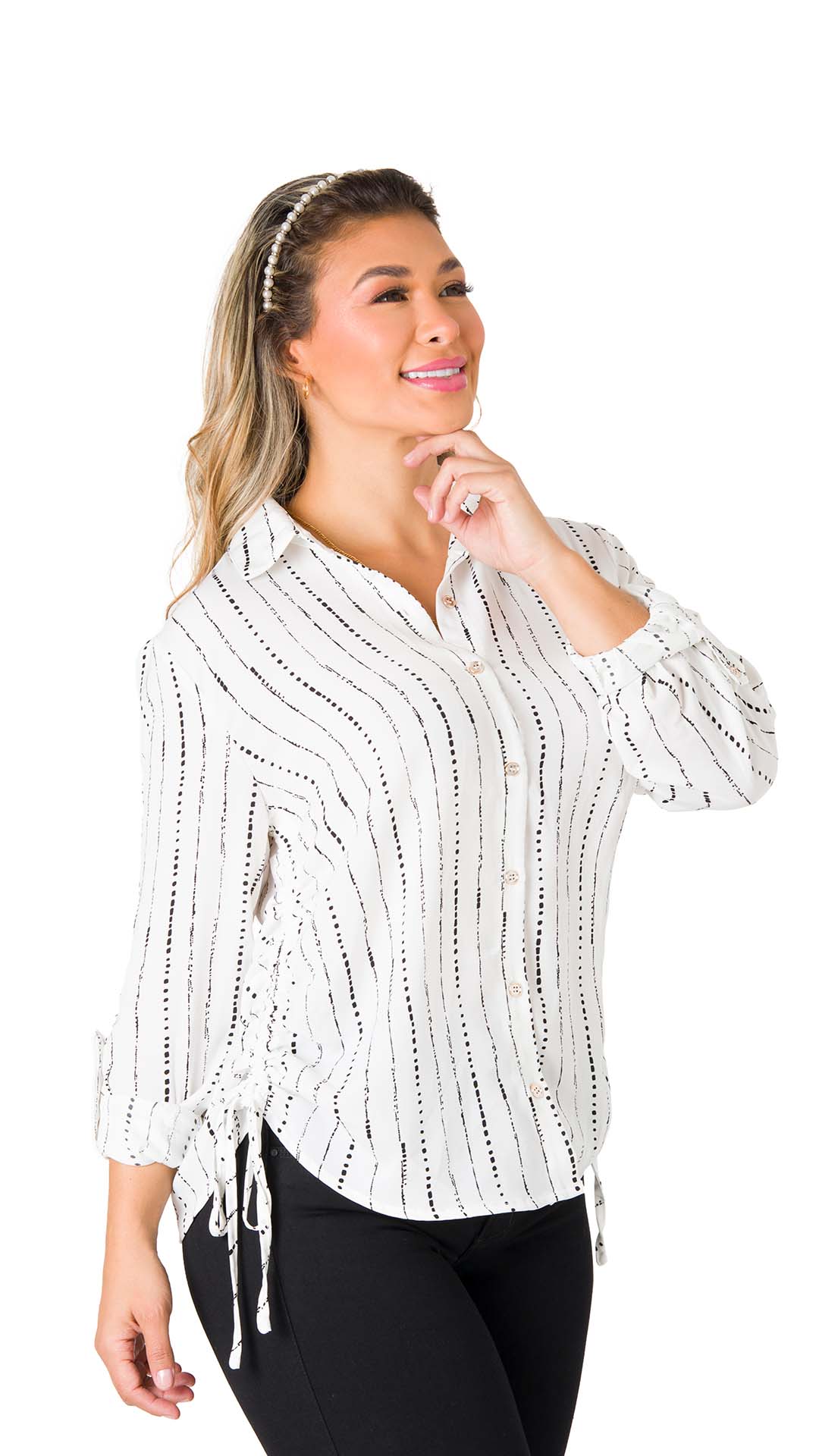 This white striped blouse is elegant and fashionable. Its adjustable drawstring design on the sides allows you to adjust the fit to your liking, creating a unique and personal look. With long sleeves and a loose cut, it is perfect for work or a casual day.