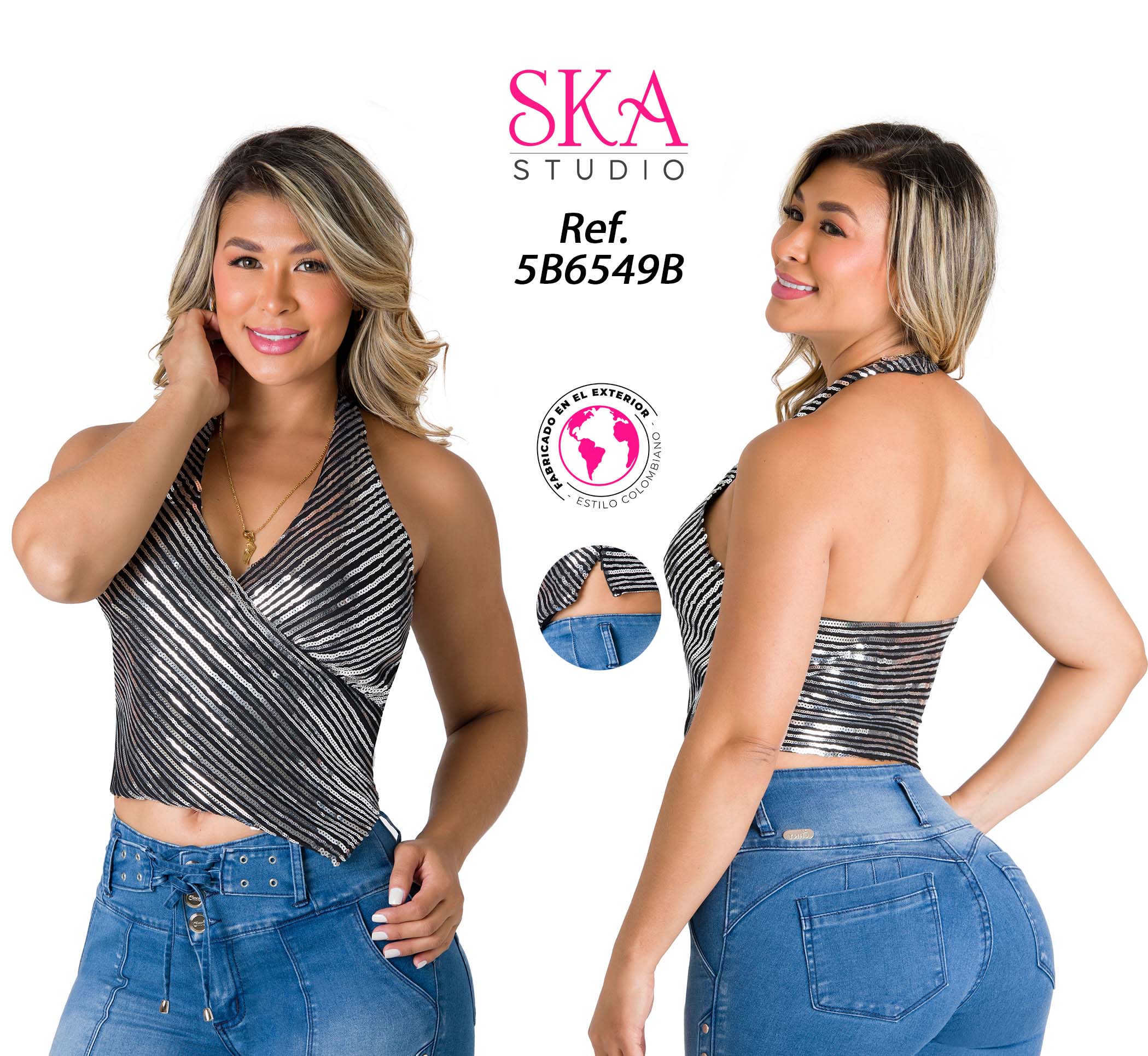 Shine spectacularly in this V-neck sequin blouse. It's the perfect choice to add a touch of sparkle to your evening outfits, ideal for any special occasion. Pair it with high-waisted jeans and high-heel sandals for a party look.