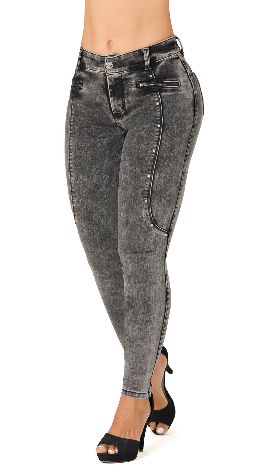 Look modern and stylish with these high-waisted, butt-lifting jeans. Featuring decorative zippers and a slim fit, they contour your hips and legs, creating a striking silhouette. Perfect for pairing with high-heeled sandals or ankle boots!