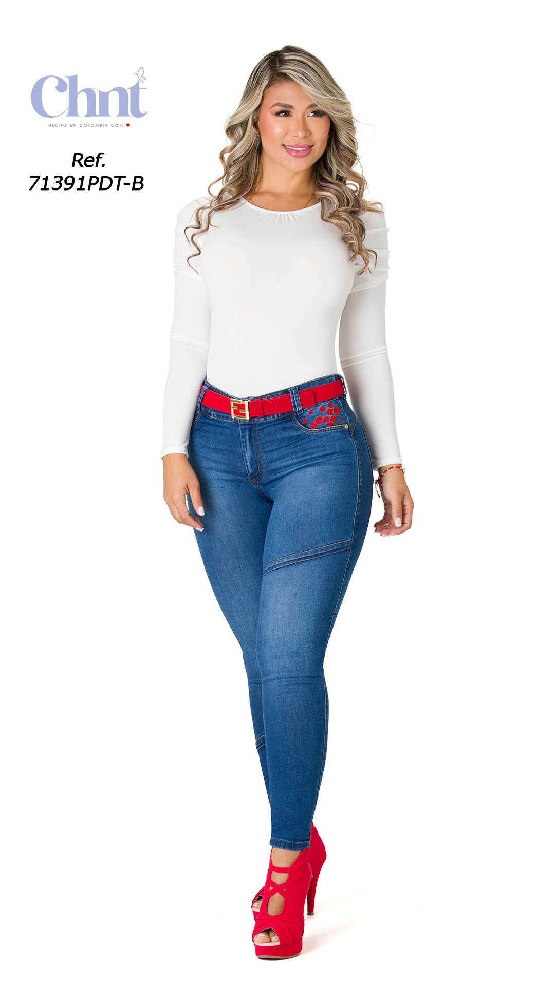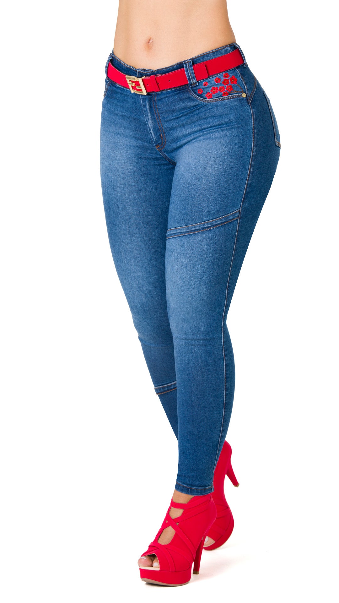 This butt-lifting jean combines style and functionality in one piece. Its snug cut, high waist, and red belt are the perfect addition to any outfit. The embroidery adds a modern and elegant touch, making it a unique piece for your wardrobe.