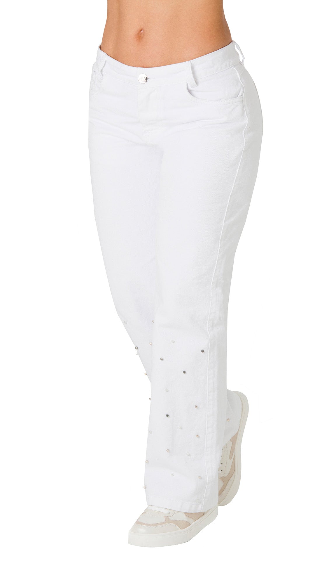 This sophisticated and fashionable white straight-leg pants, adorned with delicate pearl details, make it a unique and chic piece. Its versatile design makes it perfect for casual occasions or more formal events, highlighting your style with a touch of elegance.