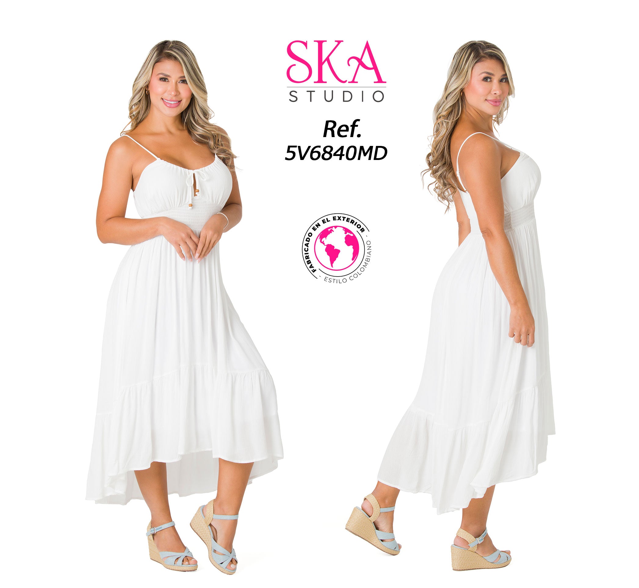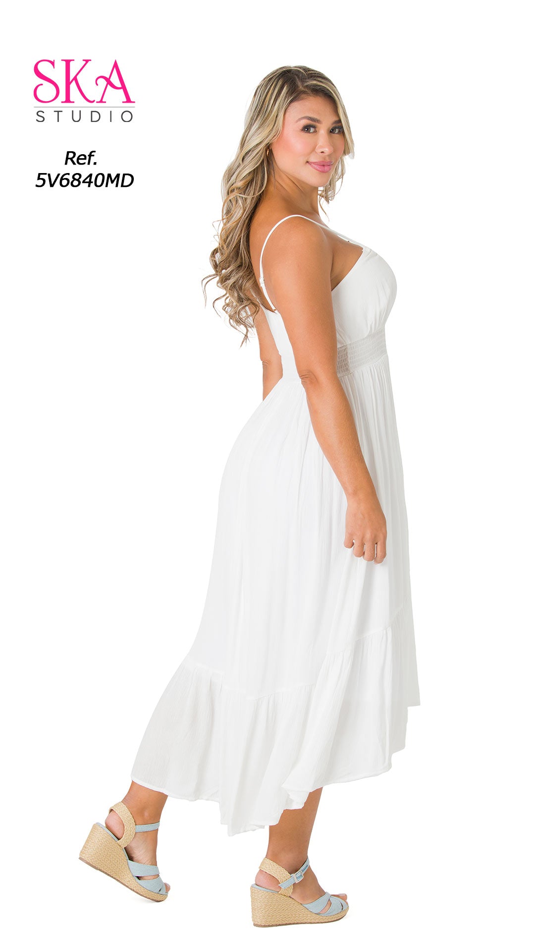 Este vestido blanco con tirantes delgados y falda asimétrica es la opción ideal para un look fresco, romántico y cómodo. Su caída ligera y escote sutil realzan la figura, mientras su diseño versátil te acompaña desde un paseo en la playa hasta una tarde especial. Llevalo con plataformas o sandalias planas.