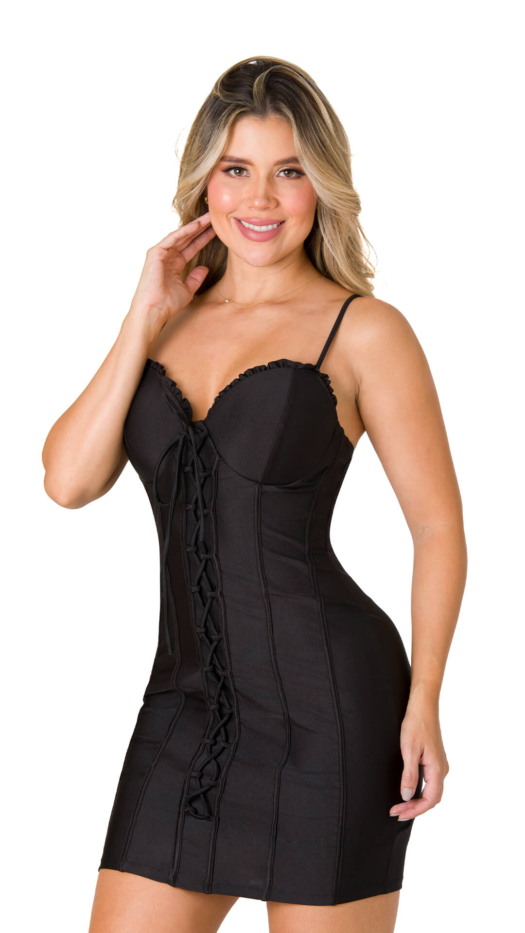 Fitted mini dress, sweetheart neckline, sleeveless and without adjustments. It has details on the front that gives the illusion of corset. Comfortable and perfect for everyday wear. If you are looking for a more formal and sexy look wear it with heeled sandals, if you are looking for a more relaxed look wear it with your favorite tennis shoes, you will look amazing!