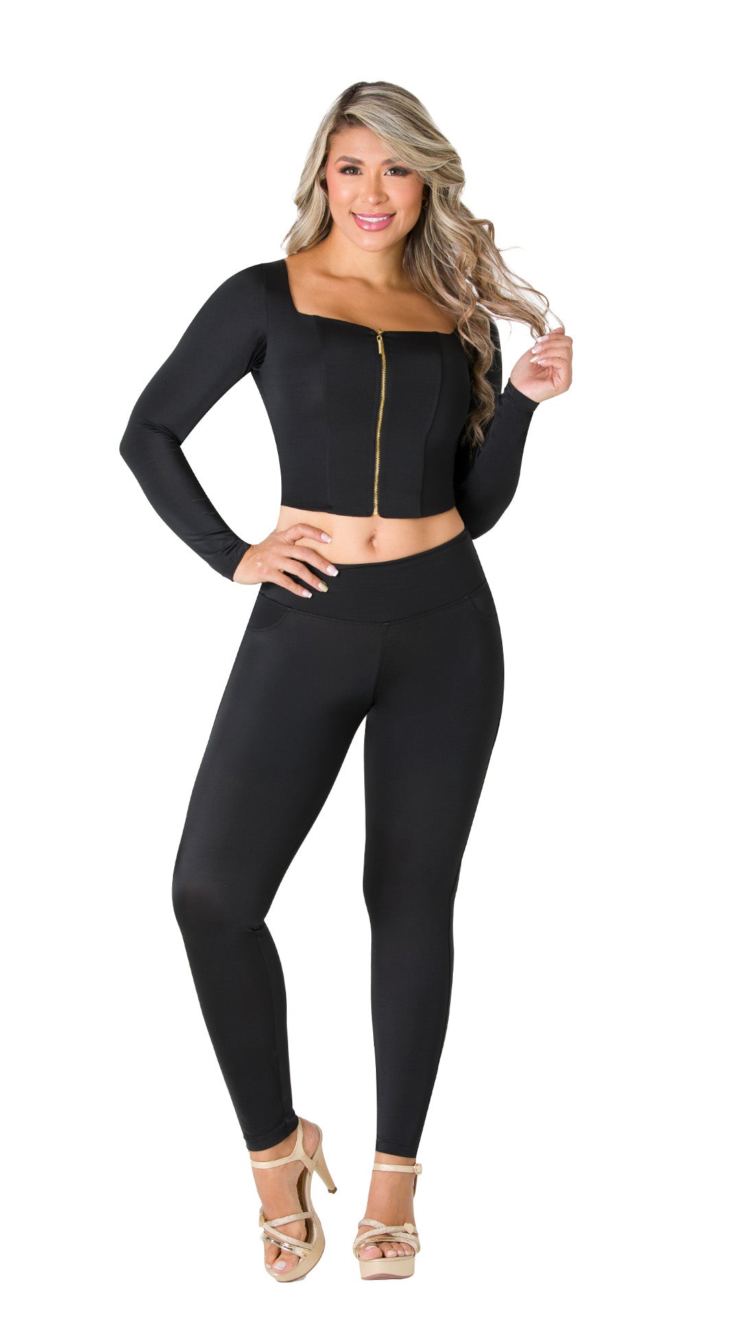 This two-piece set combines comfort and style in an elegant design. Its golden zipper and fitted cut make this garment a sophisticated option for any event. The leggings feature a shaping short with a butt-lifting effect and abdominal control, with a detail on the back waistband that highlights your sensuality.