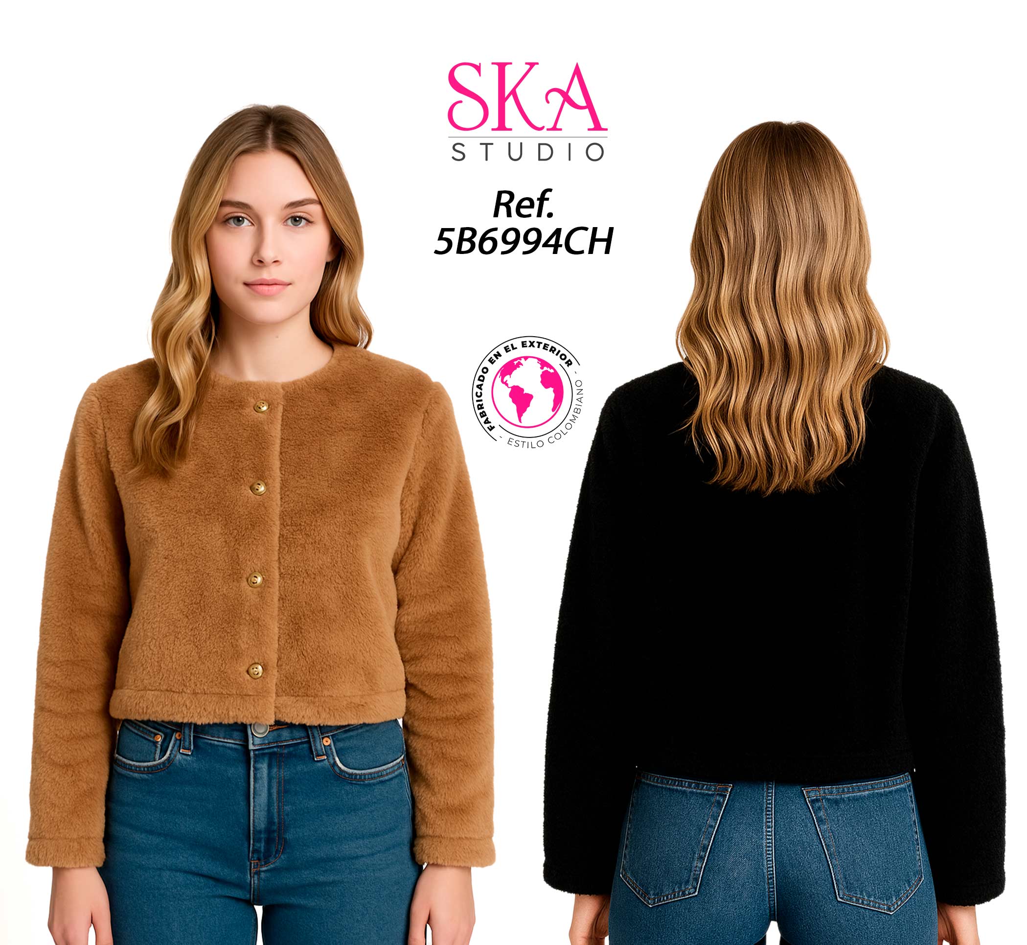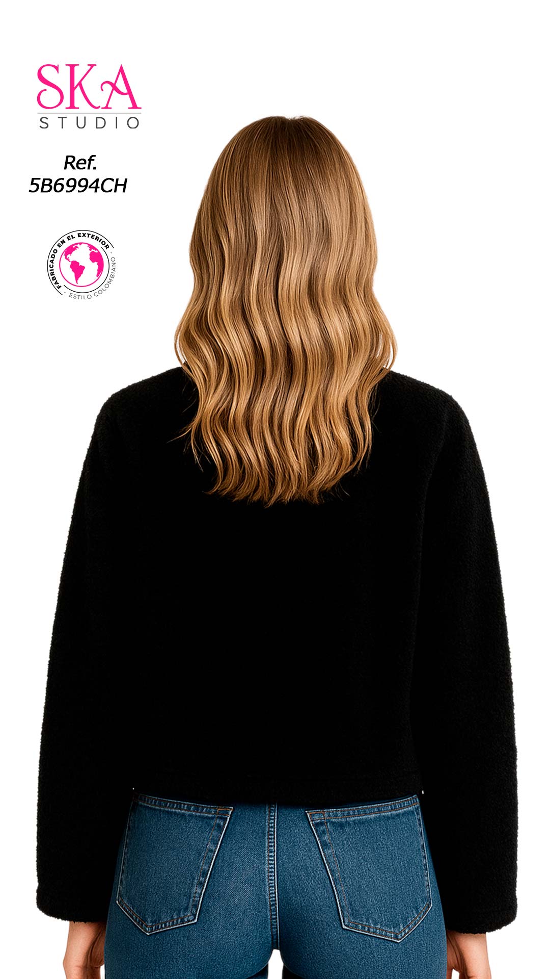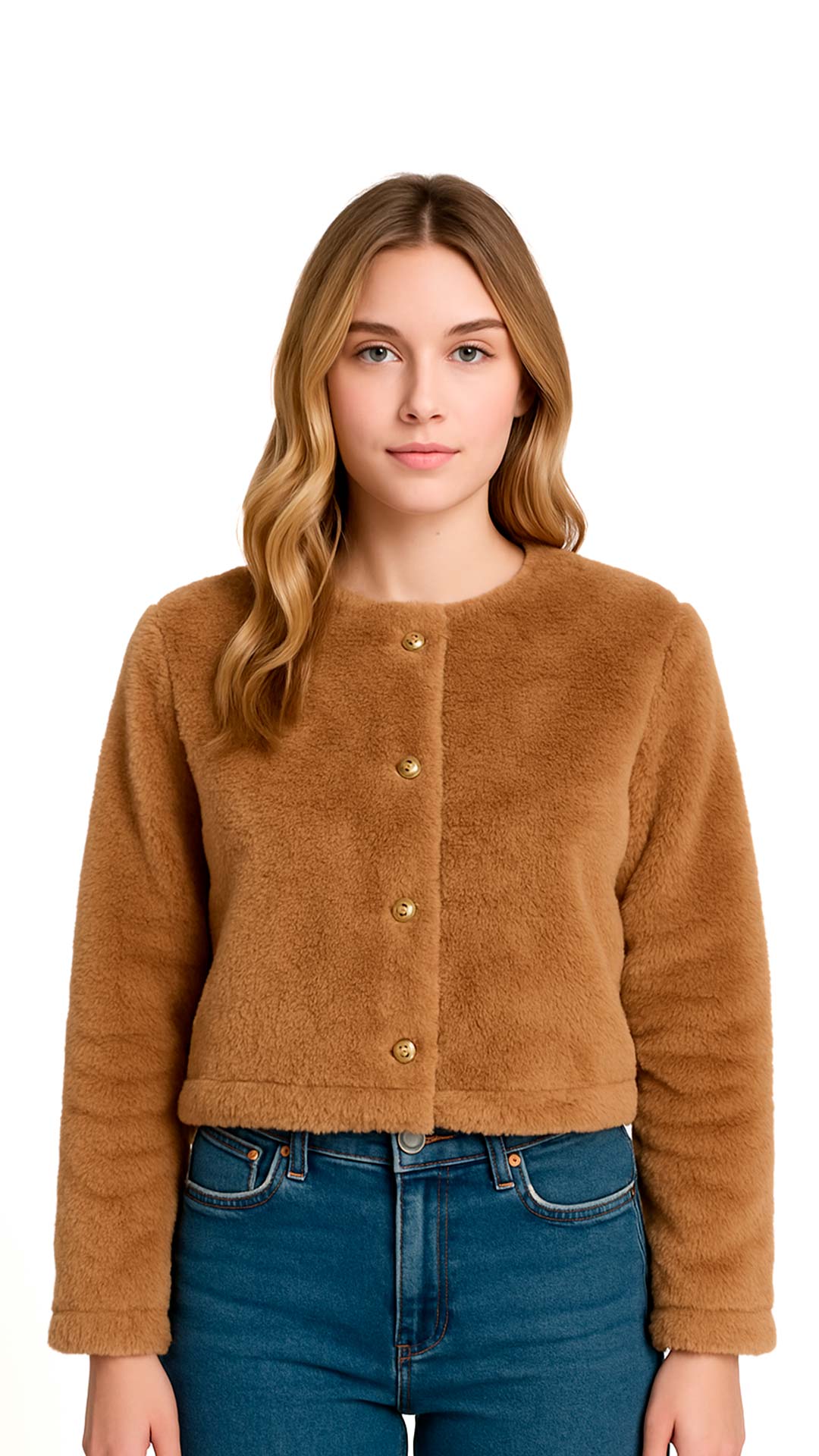 Esta chaqueta destaca por su diseño corto y su textura ultra suave que aporta calidez y estilo al instante. Sus botones frontales le dan un aire delicado y moderno, perfecto para crear outfits juveniles con un toque chic y femenino.