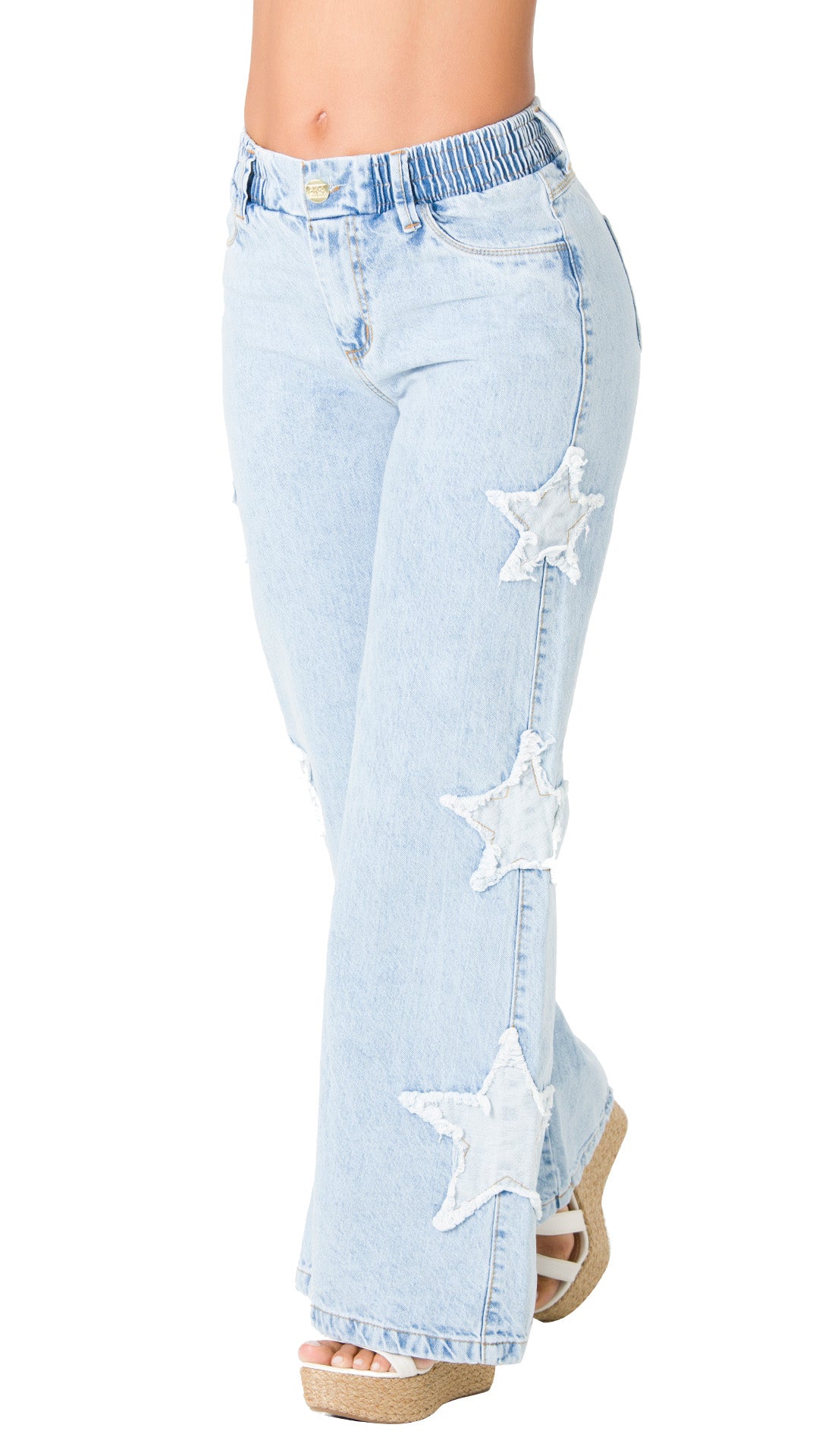 Luce diferente con este jean bota campana de tiro alto y pretina enresortada. Su diseño estiliza la silueta y las estrellas a lo largo de la pierna añaden un aire juvenil y divertido. Ideal para combinar con plataformas, blusas o chaquetas cortas para un look moderno que no pasará desapercibido.
