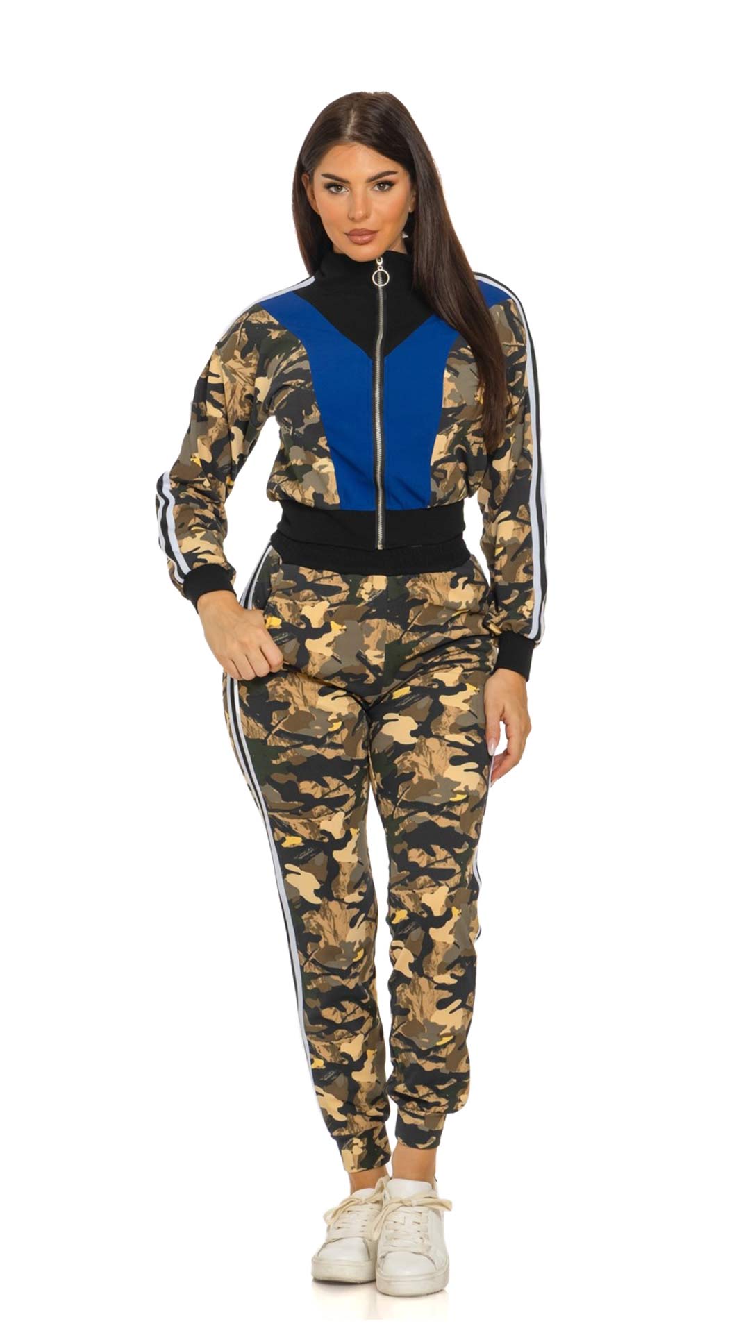 Marca tendencia con este conjunto deportivo camuflado, diseñado para quienes aman un look cómodo sin perder estilo. Su diseño ajustado resalta la silueta, mientras que los contrastes en azul y las franjas laterales aportan un toque moderno y urbano que eleva cualquier outfit casual. La chaqueta con cierre frontal y cuello alto brinda practicidad y estilo, ideal para el día a día, salidas informales o looks athleisure con actitud. Perfecto para combinar con tenis y accesorios minimalistas para un look fresco, dinámico y actual.