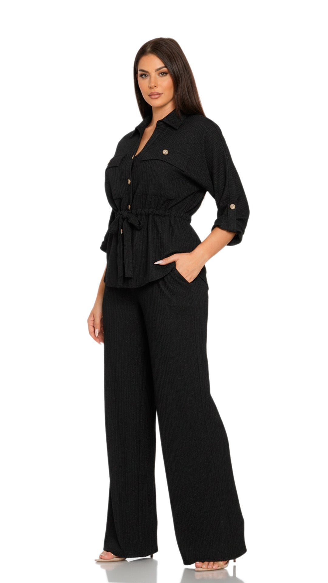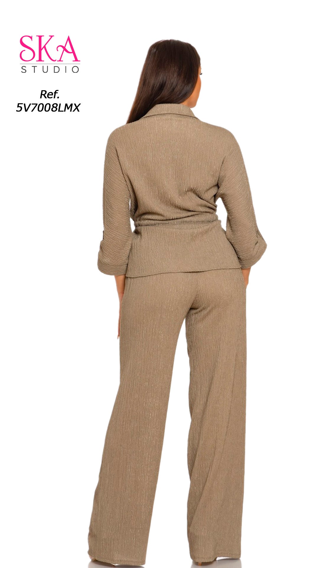 Elegancia y comodidad se unen en este conjunto de dos piezas, ideal para mujeres seguras que aman verse sofisticadas sin perder frescura. La blusa tipo camisera con botones dorados y cinturón ajustable realza tu figura y añade un toque chic y femenino.