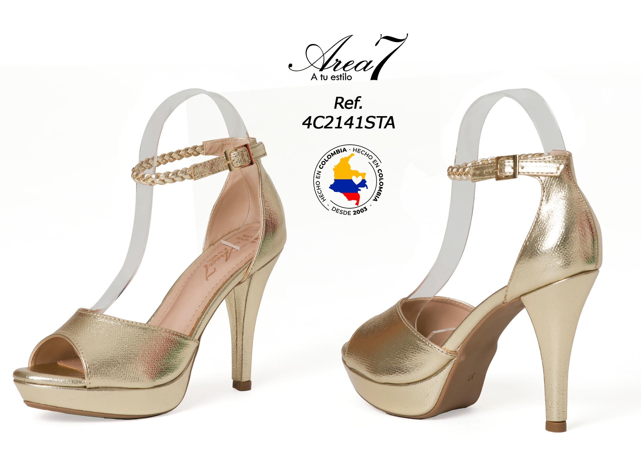 Imponente y femenina, esta sandalia de tacón alto es la elección perfecta para elevar cualquier look. Su diseño con abertura frontal, plataforma discreta y pulsera trenzada al tobillo fusiona comodidad y elegancia. Ideal para bodas, celebraciones o noches especiales donde quieras destacar con estilo.