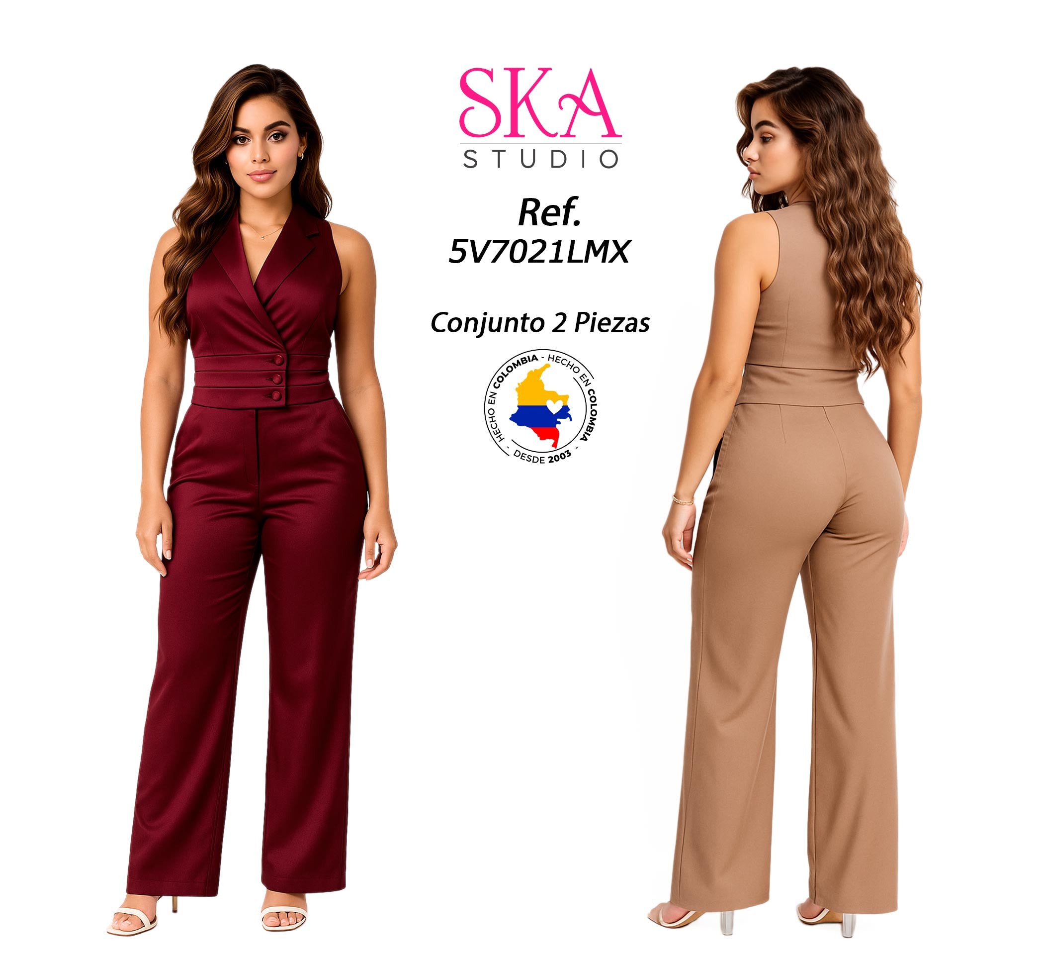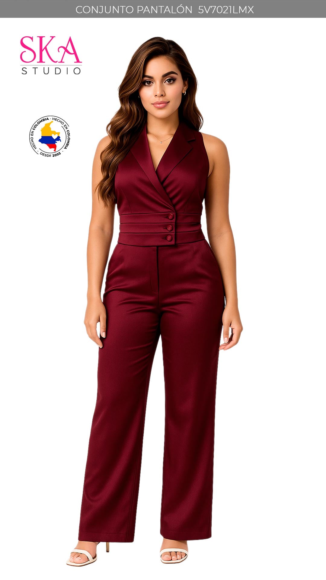 Eleva tu estilo con este enterizo color vino, perfecto para mujeres que aman verse modernas y sofisticadas. El top tipo chaleco con cruce frontal moldea el torso, la cintura entallada estiliza y el pantalón recto crea una caída elegante. Es cómodo, femenino y súper favorecedor. Ideal para eventos, fiestas o salidas donde quieras brillar con un look classy y juvenil.