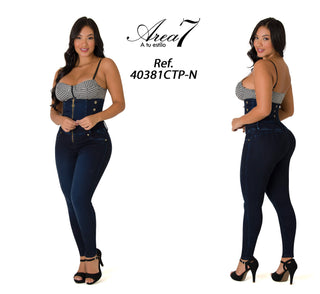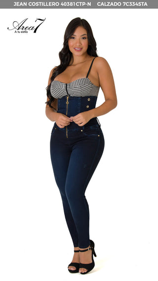 It is a super high waisted jean that ends below the bust fulfilling the function of compressing and shaping abdomen and back in a more complete way, the fabric is elastic enough to fit your body, it will also lengthen your figure. It lifts your butt thanks to the heart-shaped seams. Wear it with your favorite crop top and look more attractive than ever.
