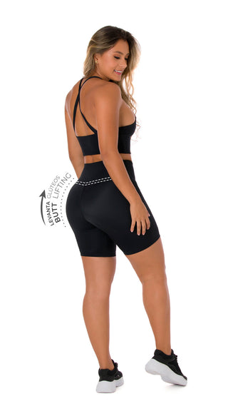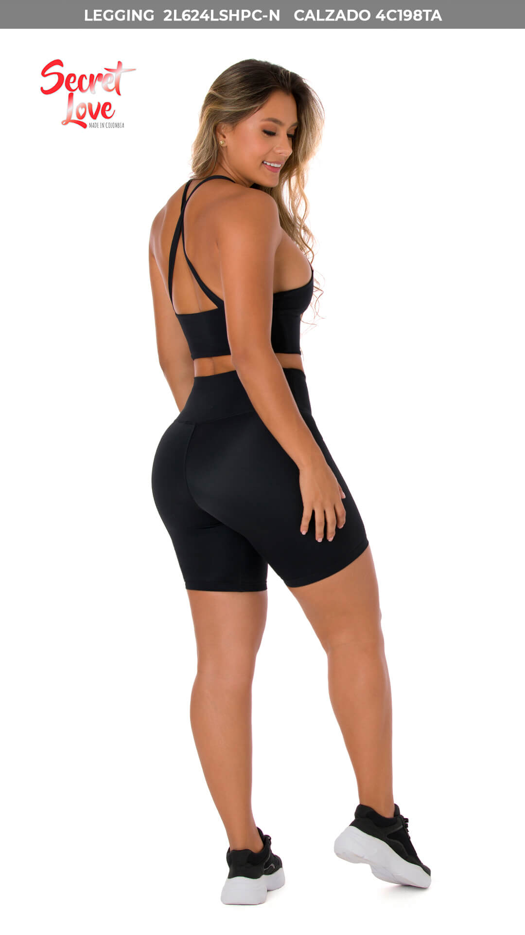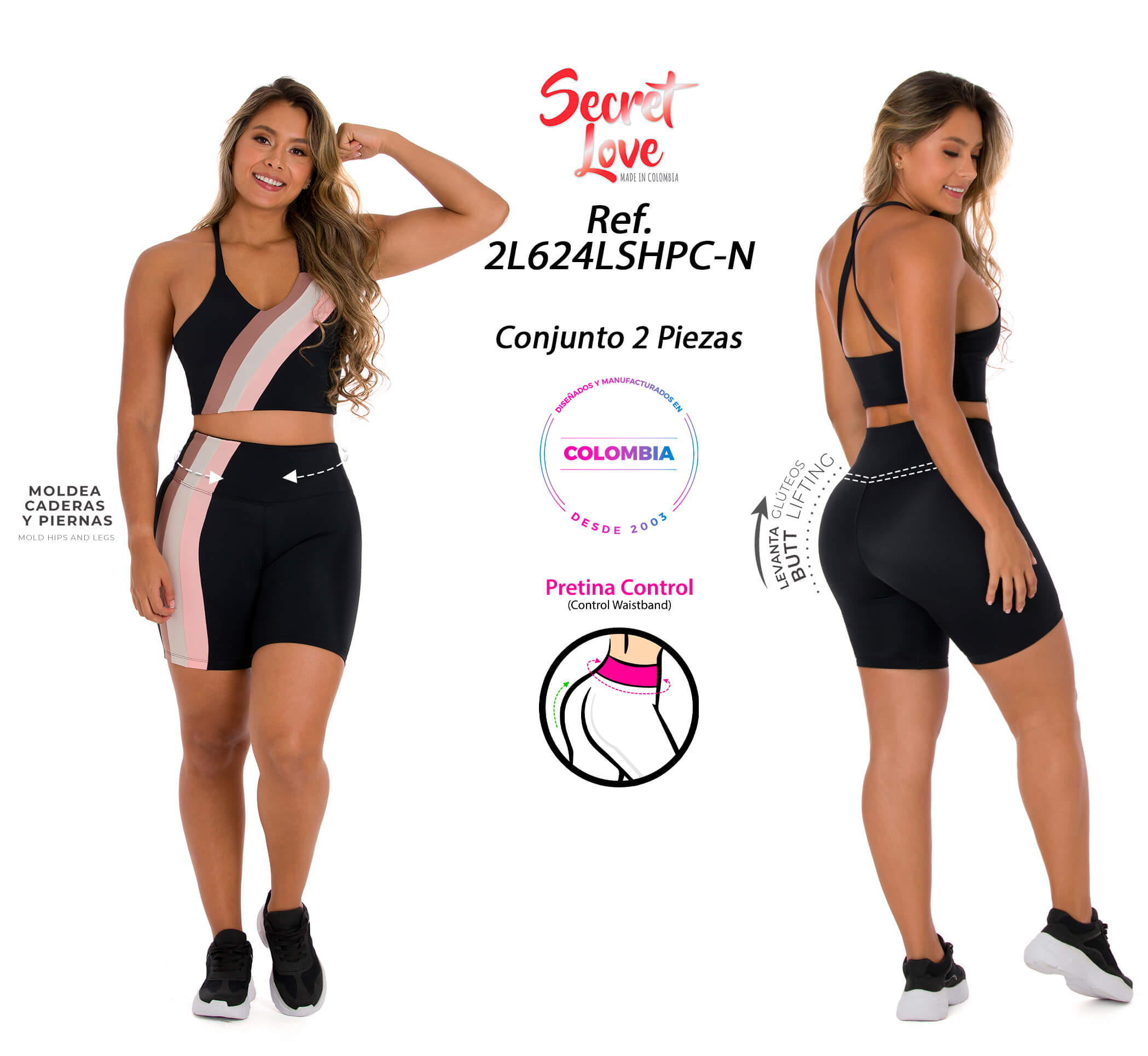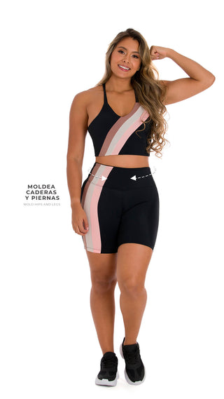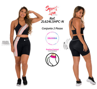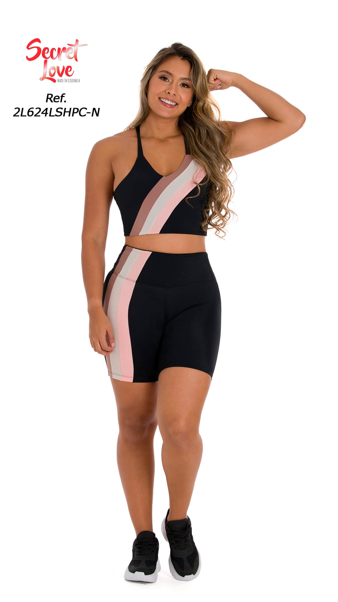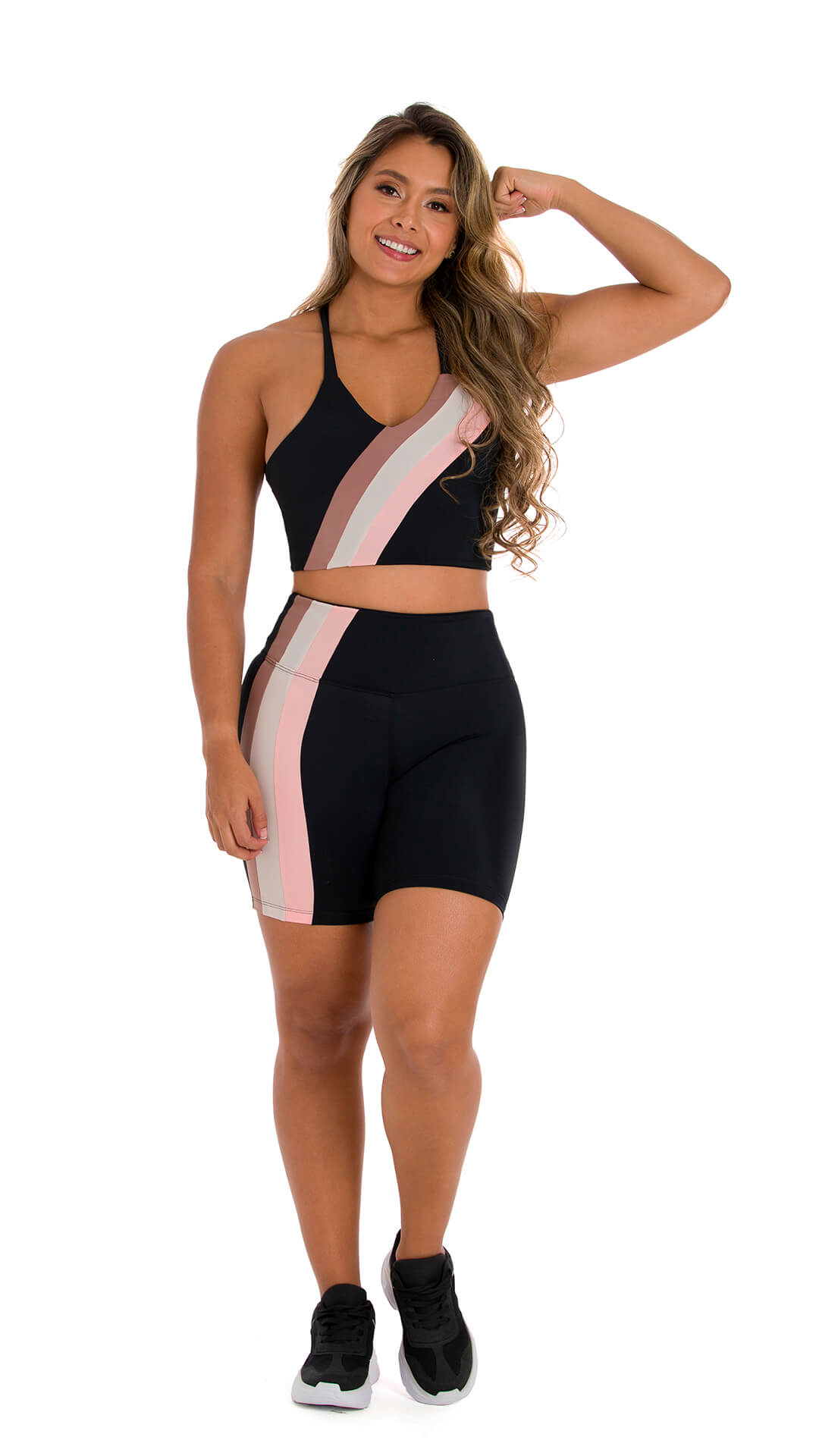 Sporty two-piece set, top and biker, ideal for a day out or for your workout routines. Its combination of colors creates a unique and charming design. Its waistband molds and hides your rolls.