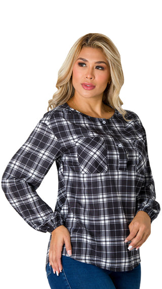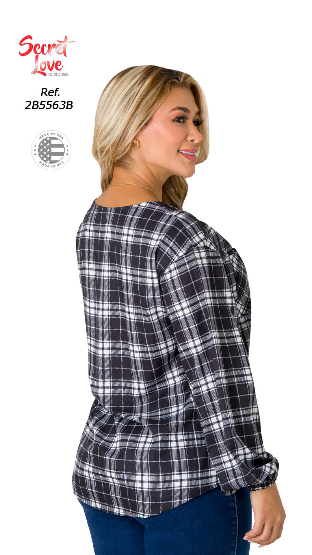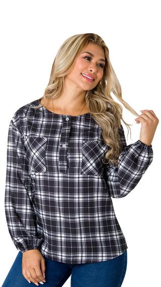 Coqueta con un estilo sofisticado, esta blusa estampada con cuello en redondo y manga larga aporta elegancia a tus días. El estampado a cuadros añade un toque de interés y feminidad resaltar tu figura. Póntelo con un jean levanta cola y disfruta de tu día.