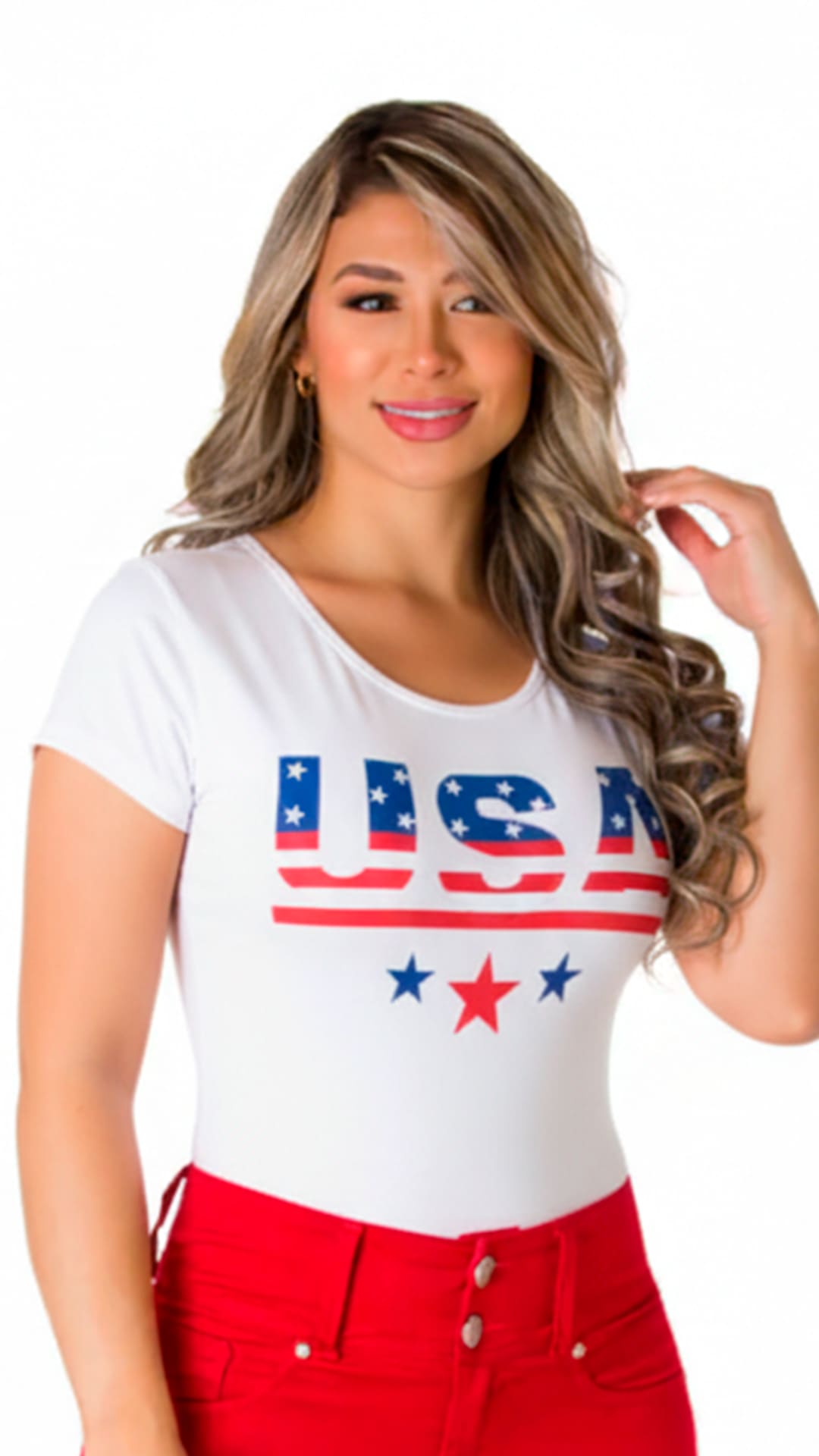 Este body blanco con diseño USA aporta un estilo moderno con inspiración americana. Su silueta ajustada se adapta al cuerpo resaltando la figura de forma natural, mientras la manga corta y el escote redondo ofrecen comodidad y versatilidad. Ideal para combinar con jeans, shorts o pantalones rojos y crear looks casuales con carácter.