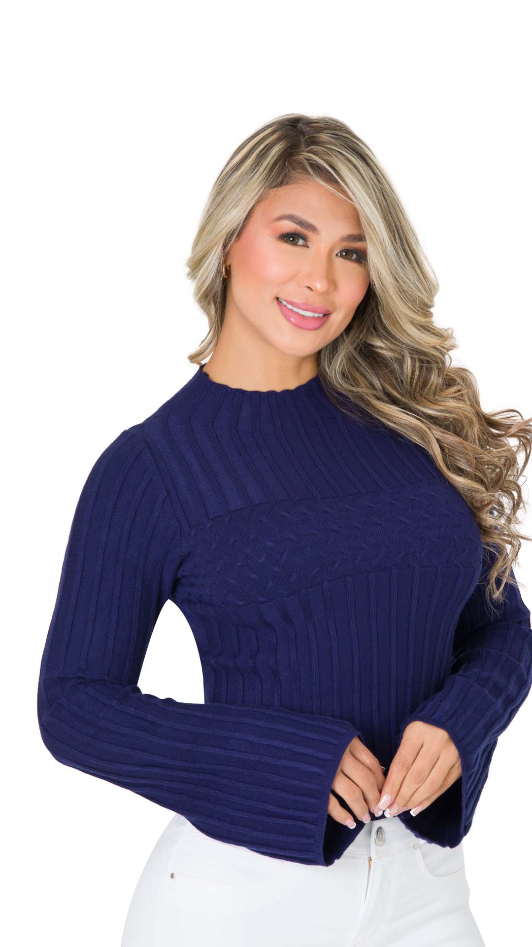 Dale un toque de elegancia y sofisticación a tu look con este sueter de punto. Su diseño con textura acanalada y mangas acampanadas le aporta un aire moderno y femenino, ideal para looks casuales o más formales.